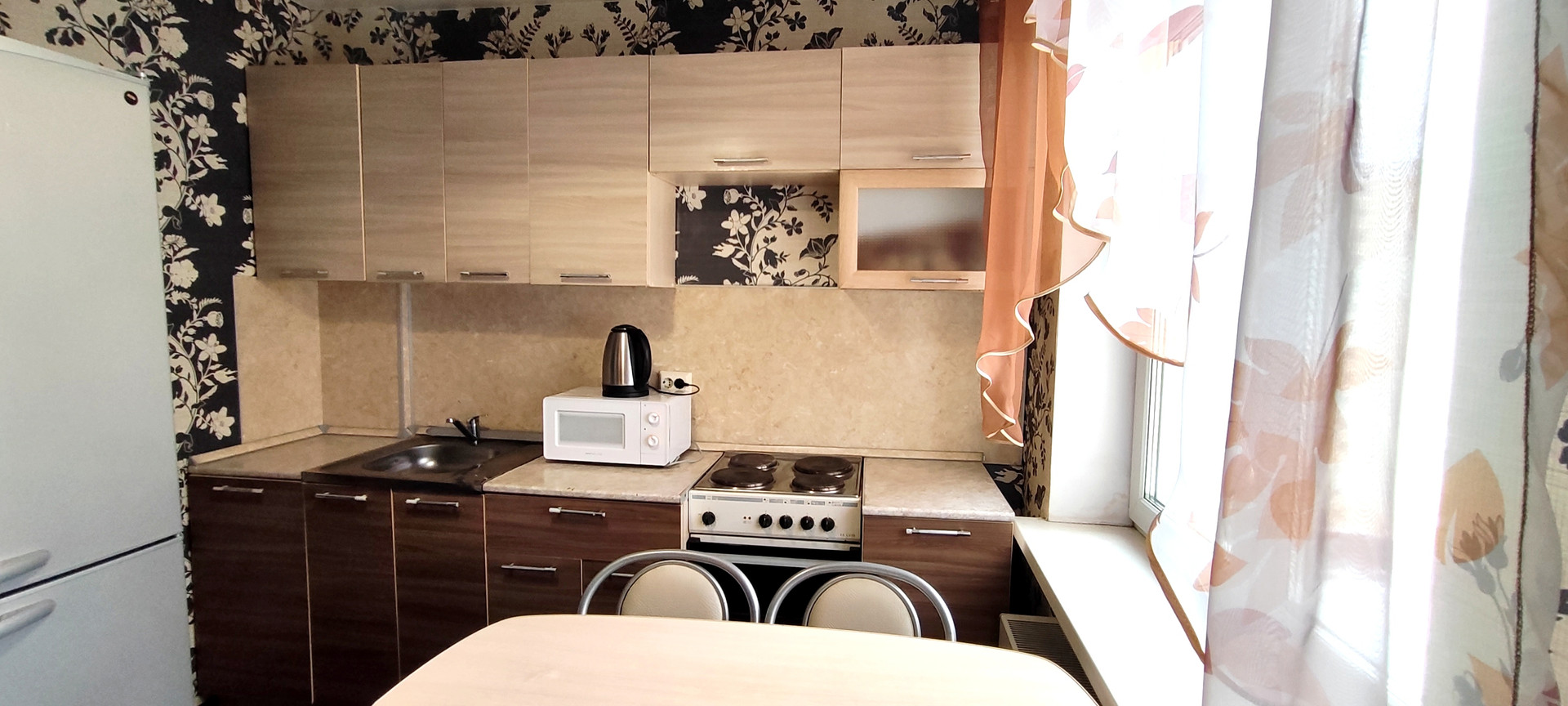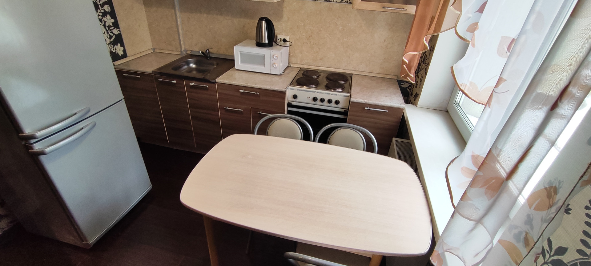 Кухня оборудована всем необходимым, есть холодильник, плита электрическая, микроволновка, обеденный стол.
