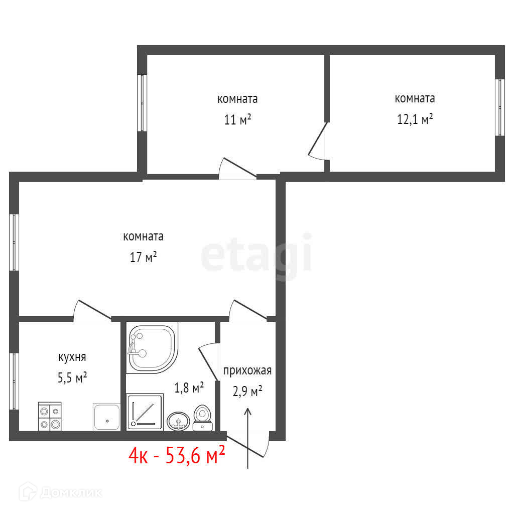Общая площадь 53.6 м2