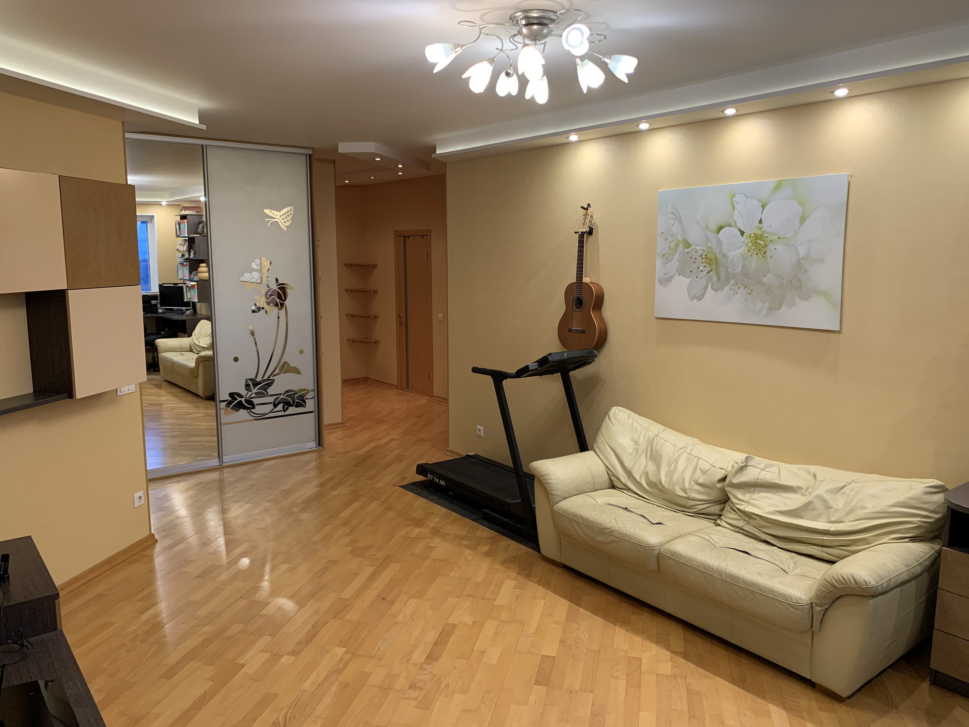 cтeклопакеты "Dесеuninck" (установлeны взамeн окoн oт зacтpойщикa), выровненные стены, паркет на полу во всех комнатах, теплые полы в прихожей, санузлах и на балконе, санузлы отделаны кафелем, межкомнатные двери из массива, многоуровневые потолки с различными сценариями освещения, прихожая оборудована вместительным шкафом - купе, установлены кондиционеры, водонагреватель, установлены счетчики отопления (низкие коммунальные платежи).