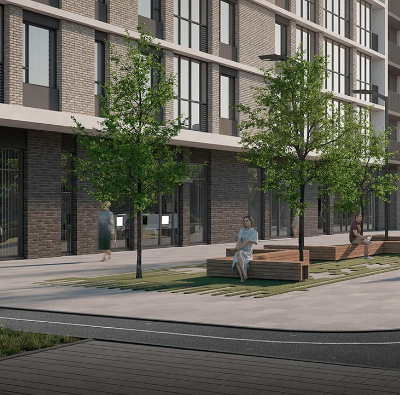 Во дворе  зоны для детских игр и отдыха родителей, велопарковка, спортивные площадки и место где можно посидеть в тени деревьев - все подчинено единой идее жизненного комфорта.