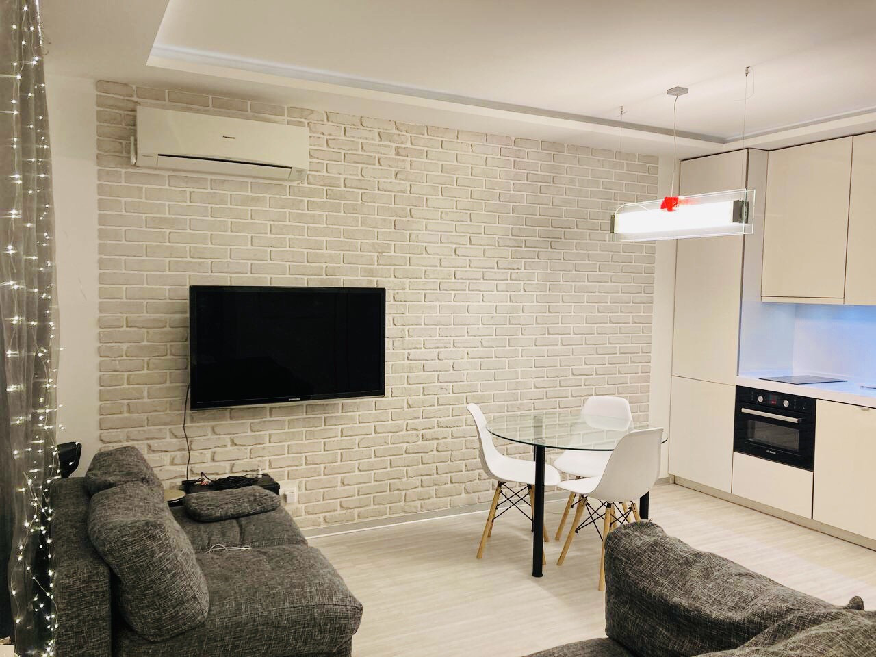 Гостиная - пол керамогранит с подогревом, встроенные потолочные светильники, подвесной светильник над обеденной зоной;