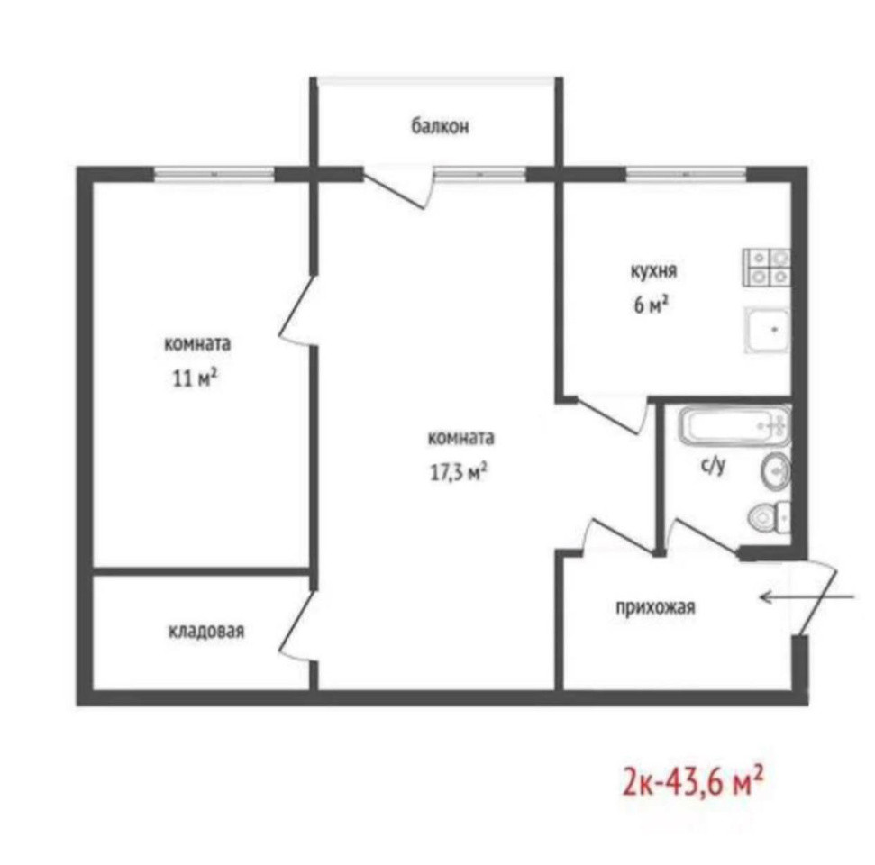 Общая площадь 43.6 м2