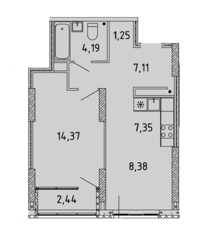Функциональная планировка квартиры: просторный коридор с гардеробной 7,11+1,25 кв.м., кухня-гостиная 15,73кв.м., комфортная площадь комнаты 14,37кв.м., лоджия 2,44кв.м, панорамное остекление окон в квартире.