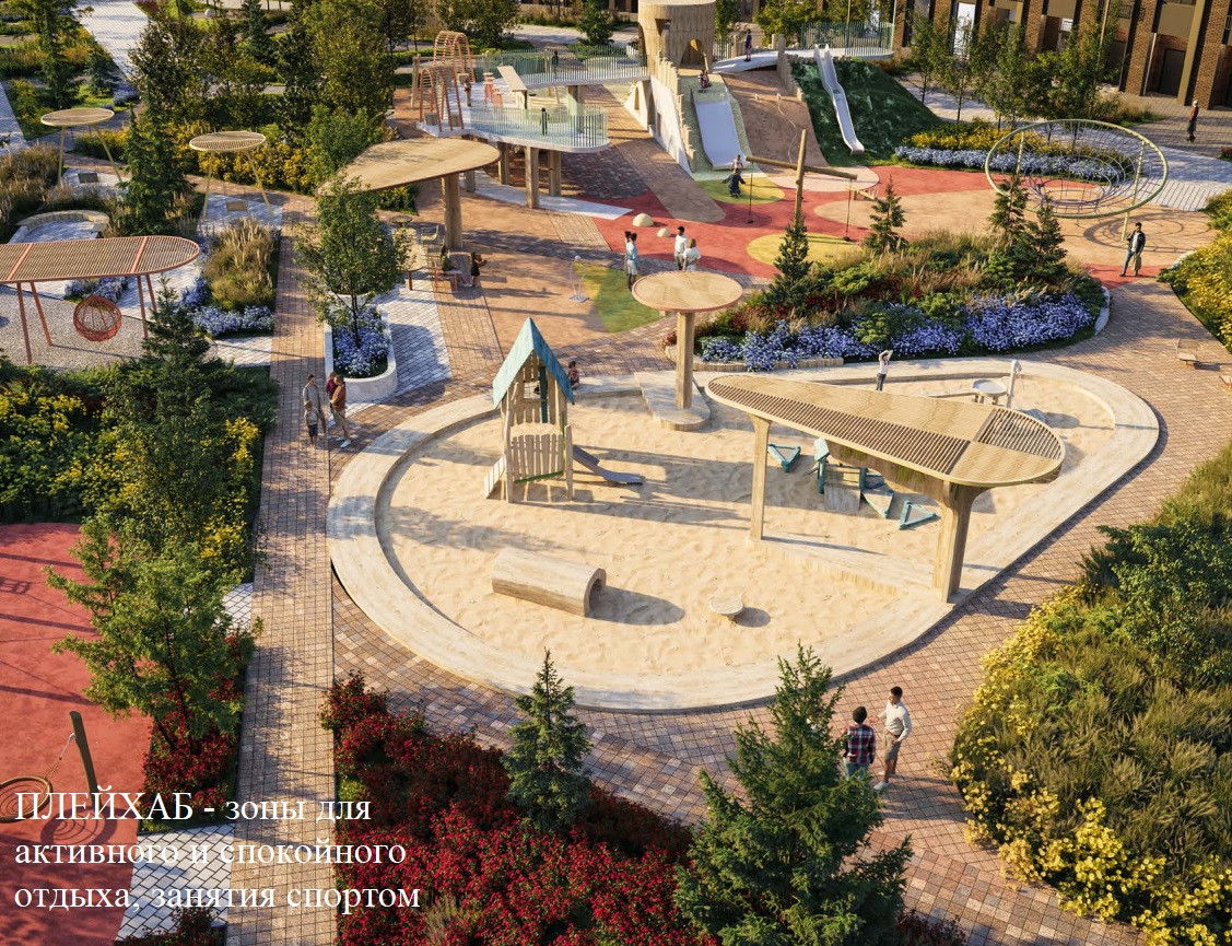 Внутренняя территория – двор-сад с приватной территорией, с зонами активного и спокойного отдыха, занятия спортом;