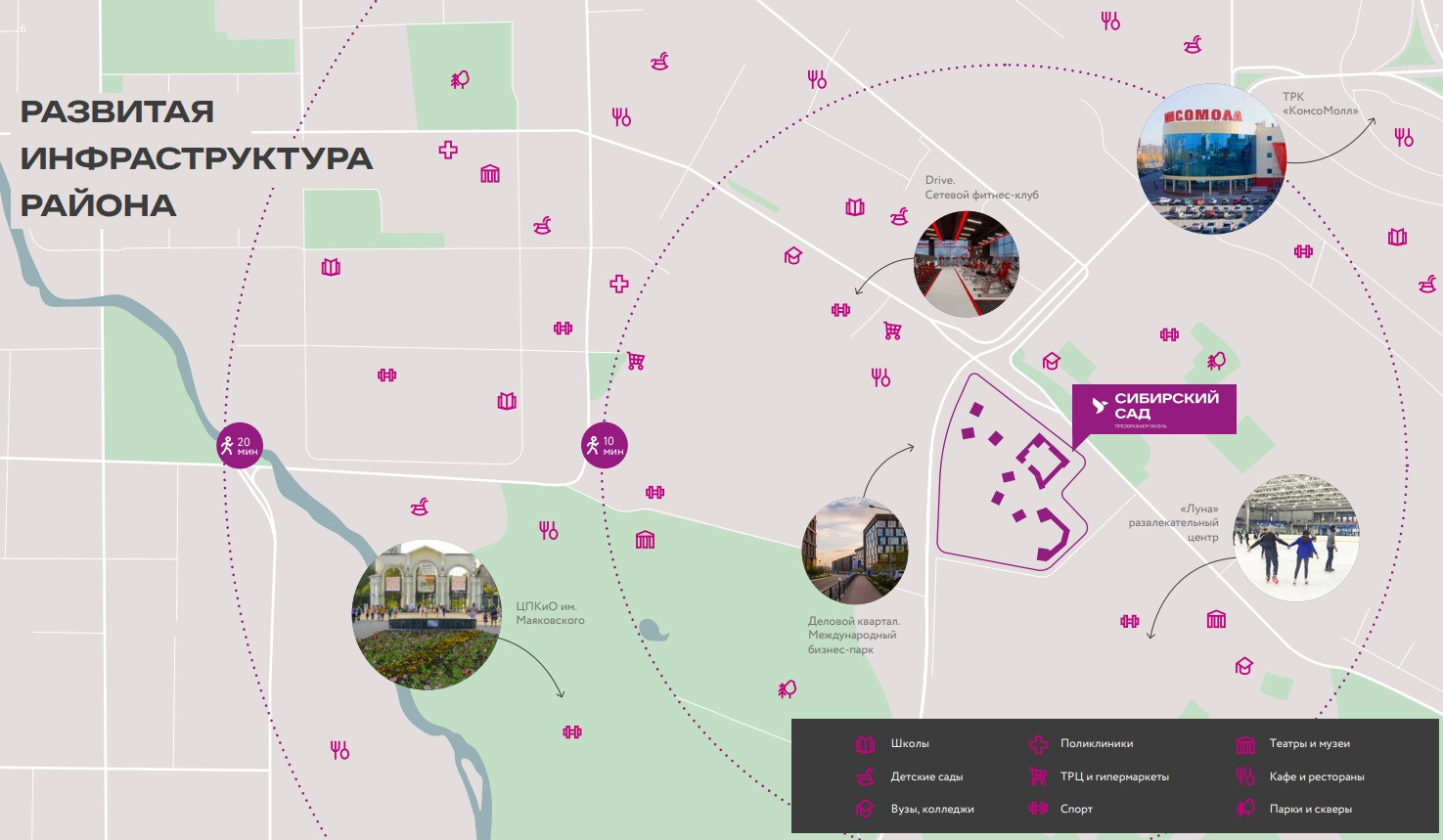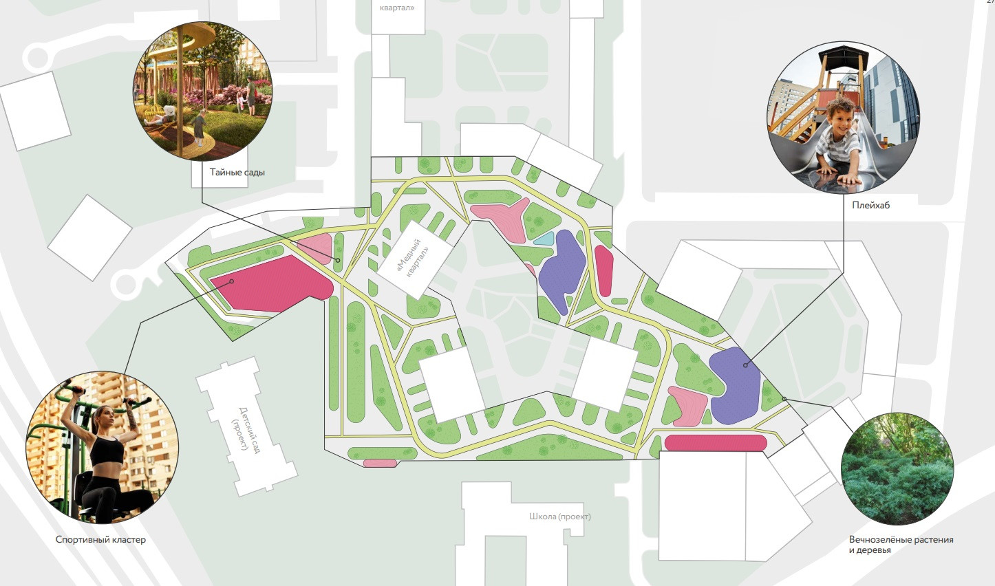 Образовательные учреждения - планируется строительство муниципальной школы и детского сада, с приоритетом для жителей комплекса.