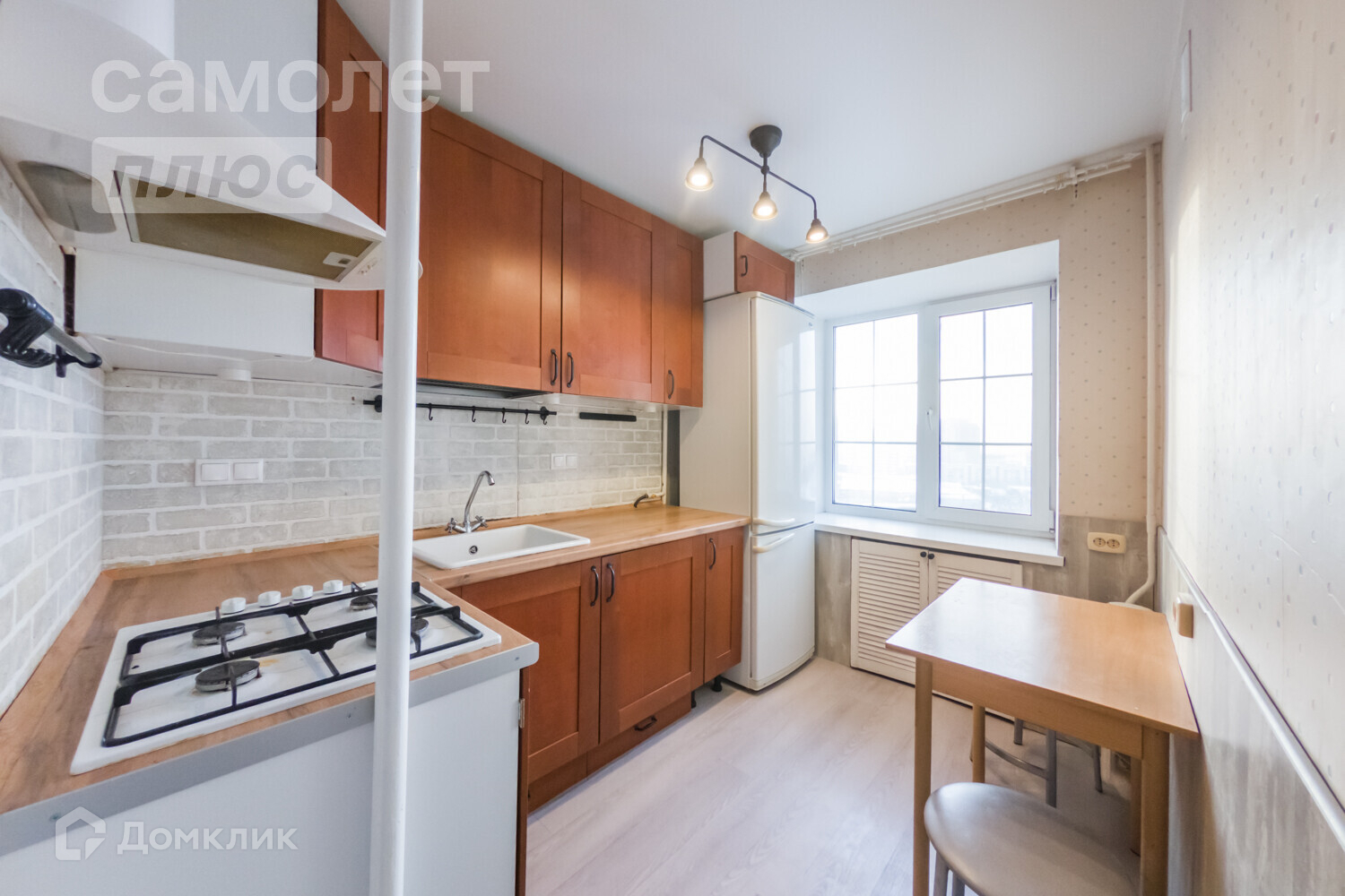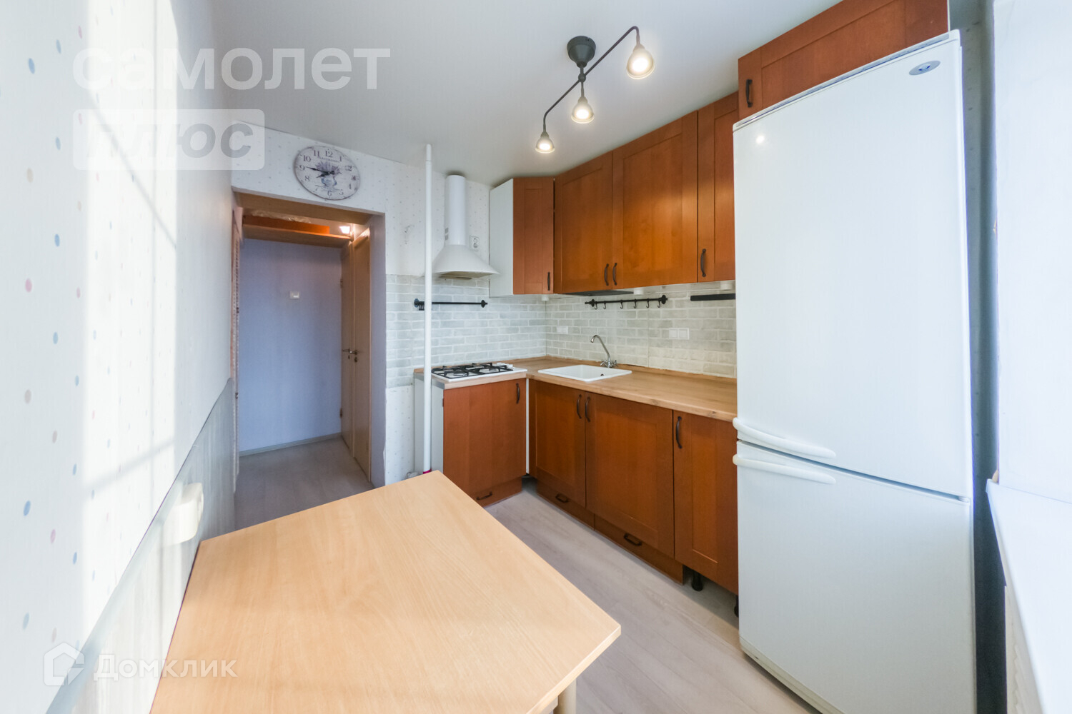 Достоинства кирпичного дома дополняют пластиковые окна. Уютная кухня с фасадами из натурального дерева гармонично вписывается в уютную и приятную атмосферу квартиры.