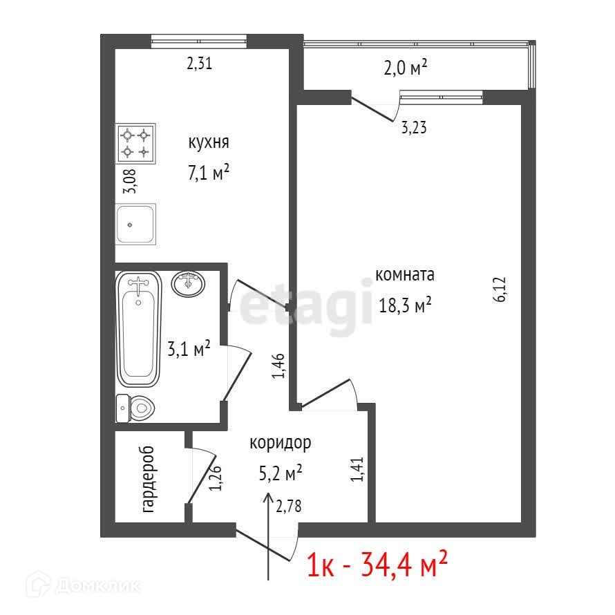 Общая площадь 34.4 м2