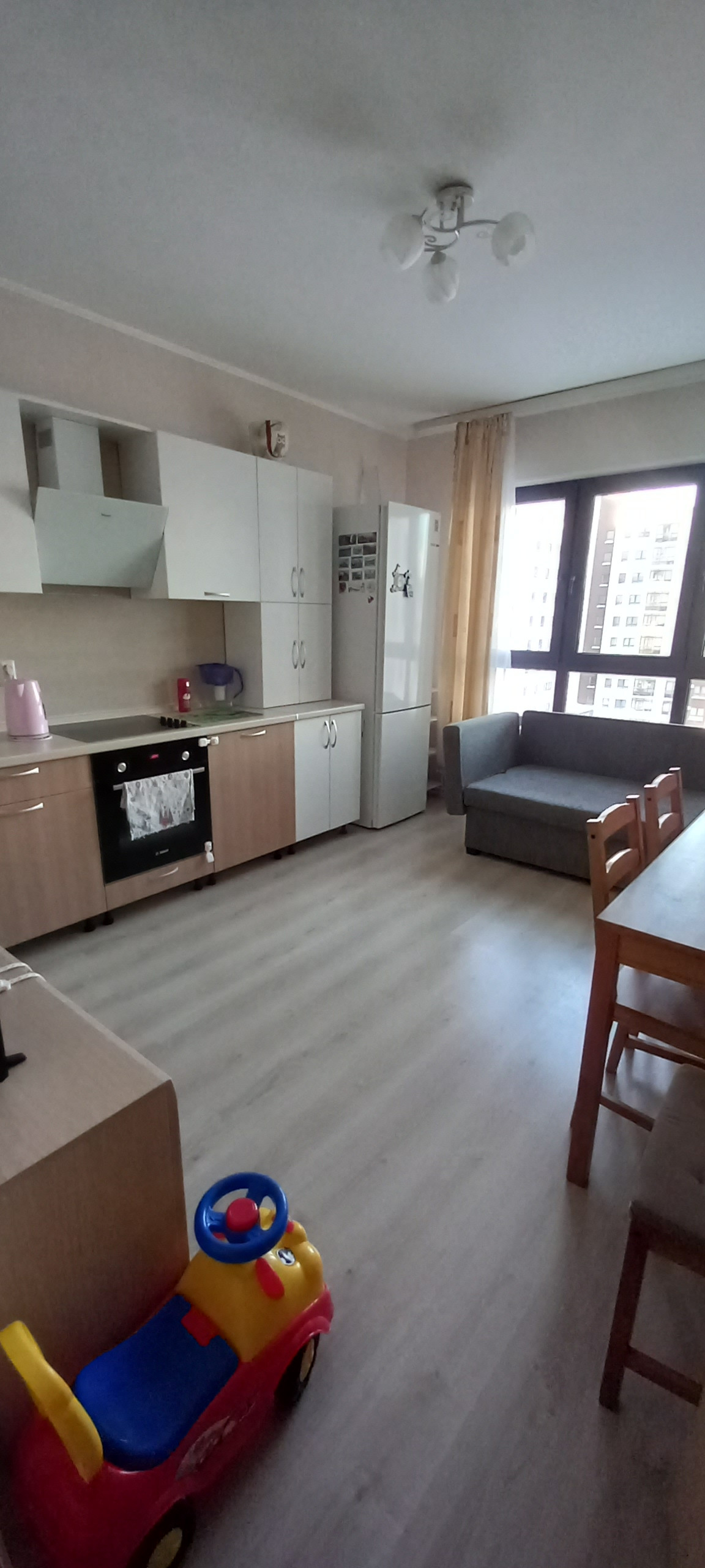 Уютная светлая квартира, окна выходят во двор и на улицу. В квартире сделан ремонт от застройщика ЛСР, в ванной плитка, в кухне установлен гарнитур со всей техникой: варочная поверхность, духовой шкаф, вытяжка. Закрытый двор, внизу дома расположены все необходимые магазины, аптеки, салоны, управляющая компания. Во дворе дома имеются детская площадка и спортивный корт. Зимой на территории спортивного корта в свободном доступе залит каток. Рядом школа и детский садик. Транспорт в шаговой доступности (автобус – 5 мин., трамвай – 15 мин.). Удобный выезд на ЕКАД.
