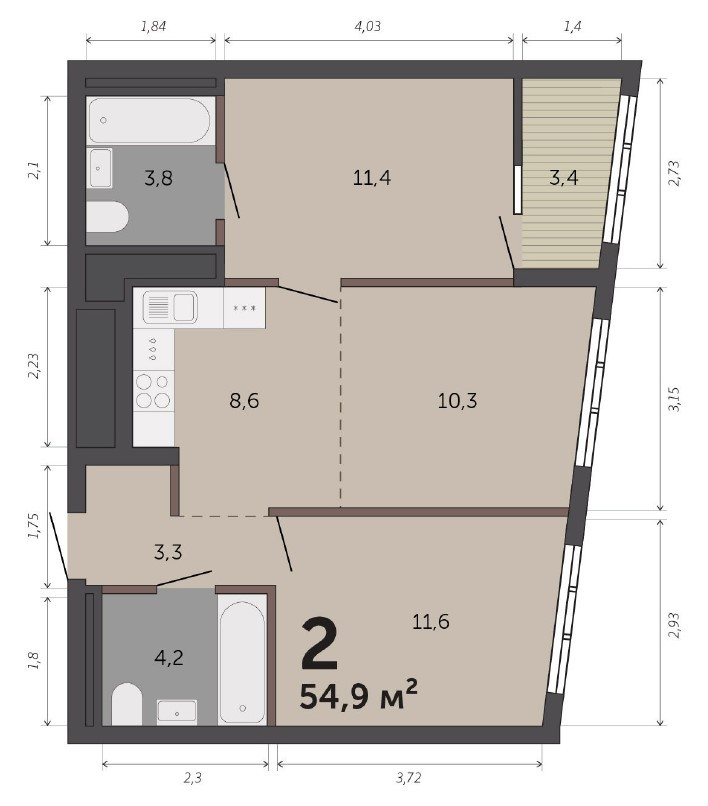 Общая площадь 55 м2