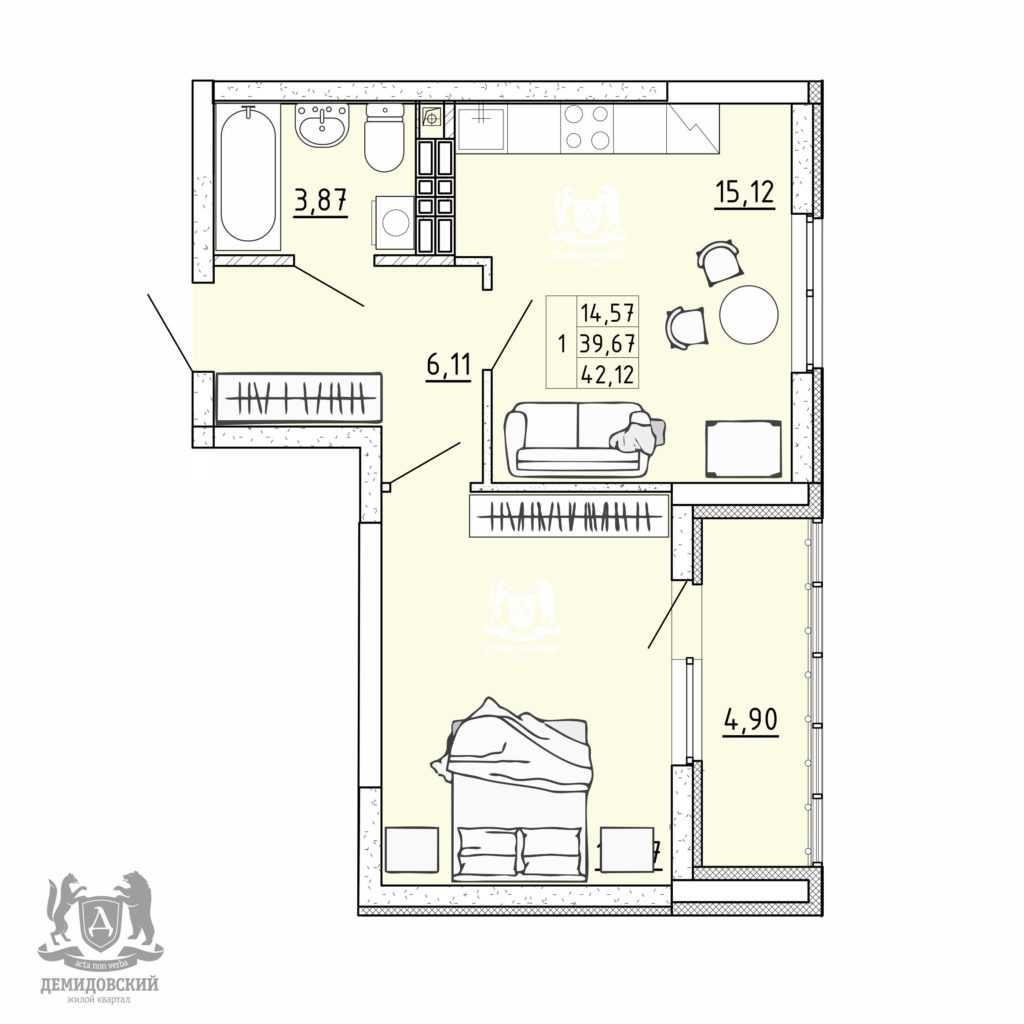 1-комнатная квартира, 40 м2, этаж 4 / 17, на продажу в Екатеринбурге, улица Энтузиастов, 36Б/3