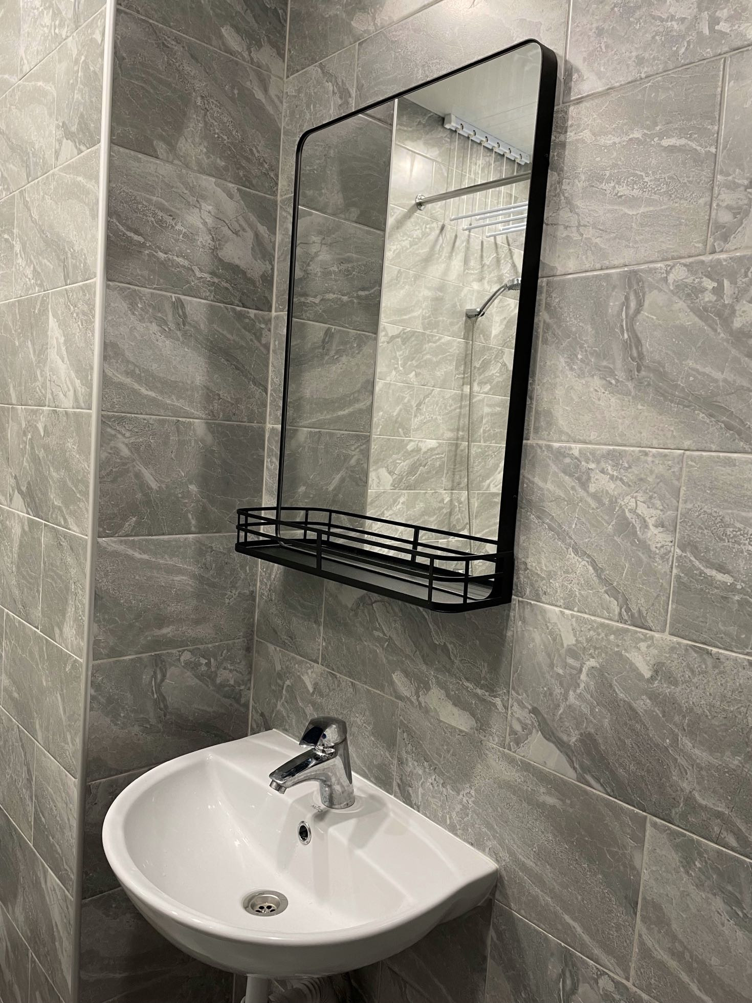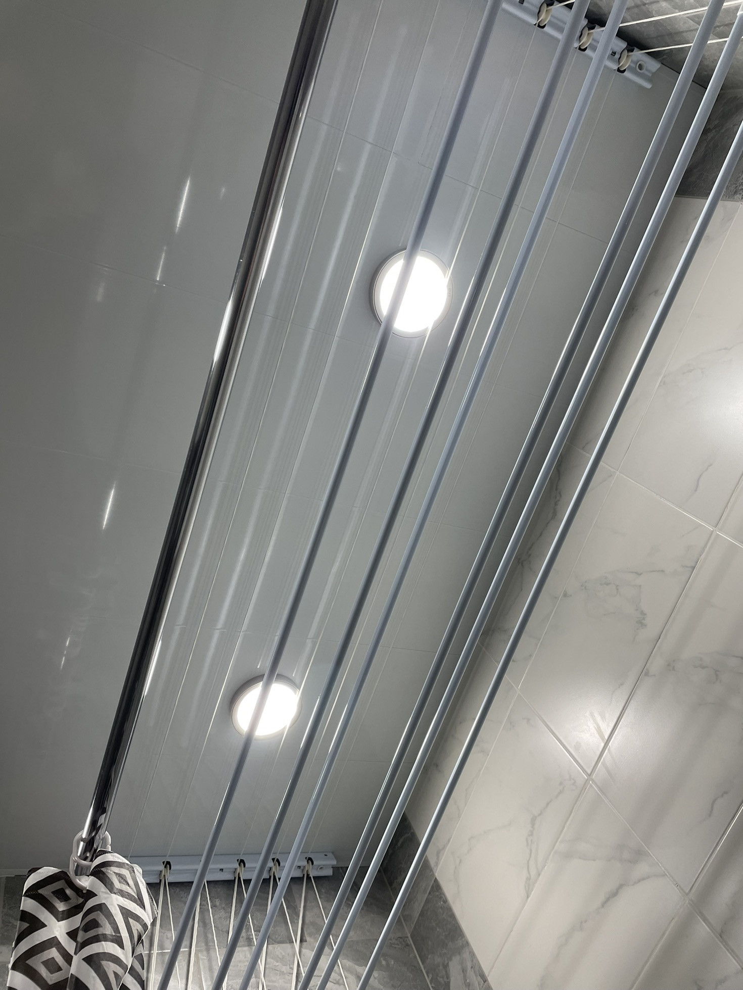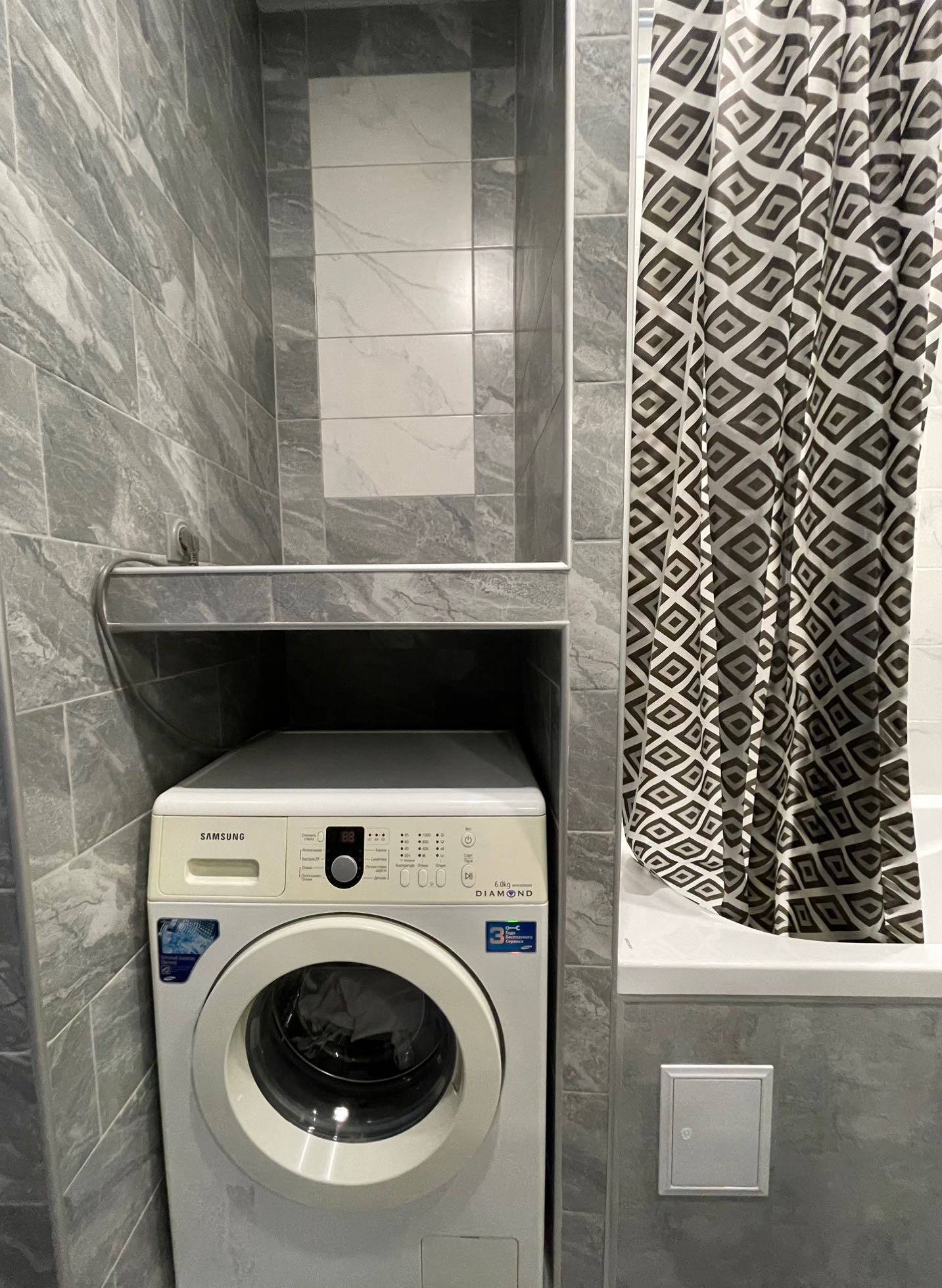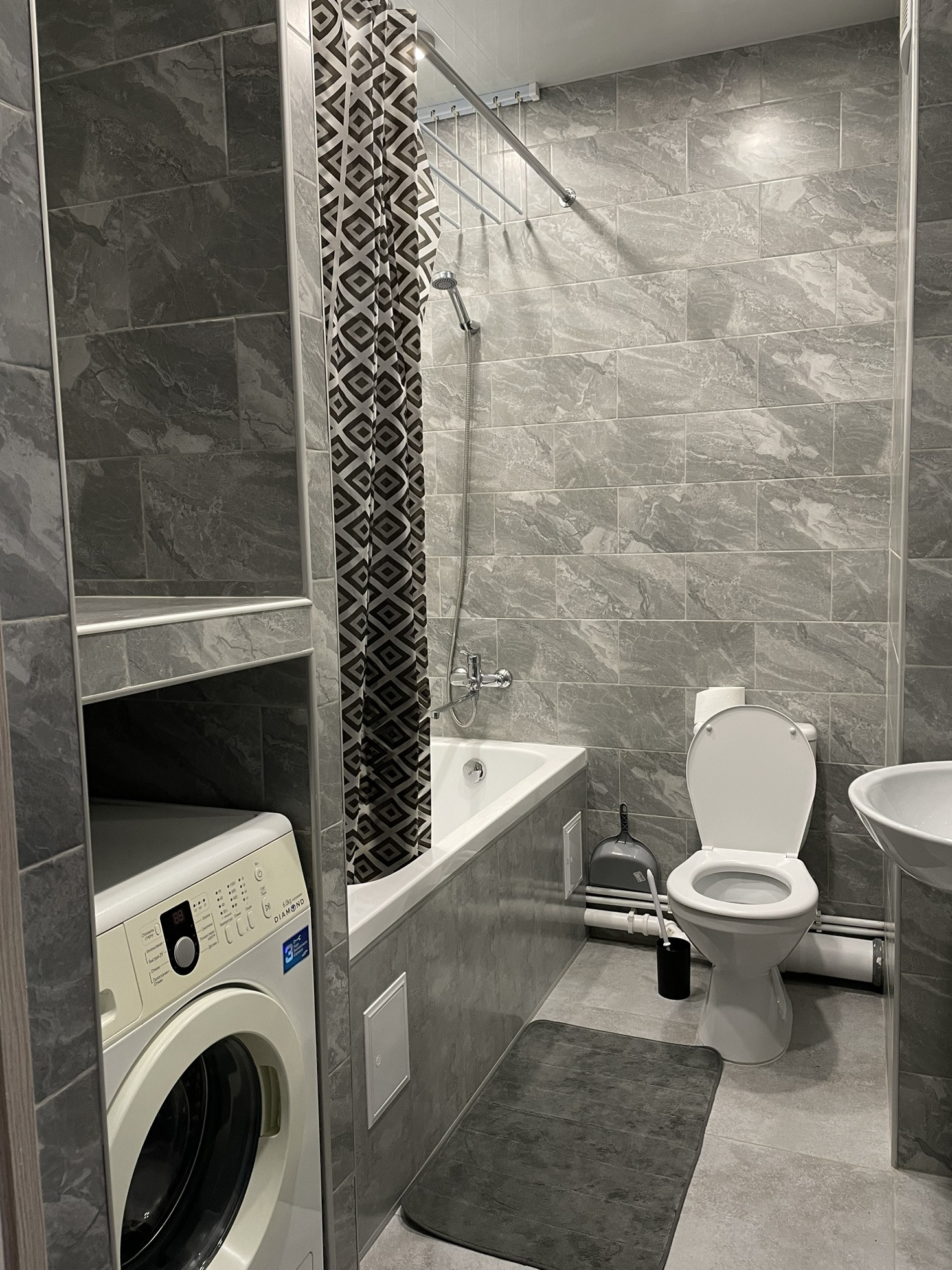 Санузел полностью выложен из плитки. Сделана перегородка для стиральной машинки и для места хранения. Установлена хорошая ванная с зоной для сушки вещей, также установлены точечные светильники с двумя режимами: холодный и тёплый.
