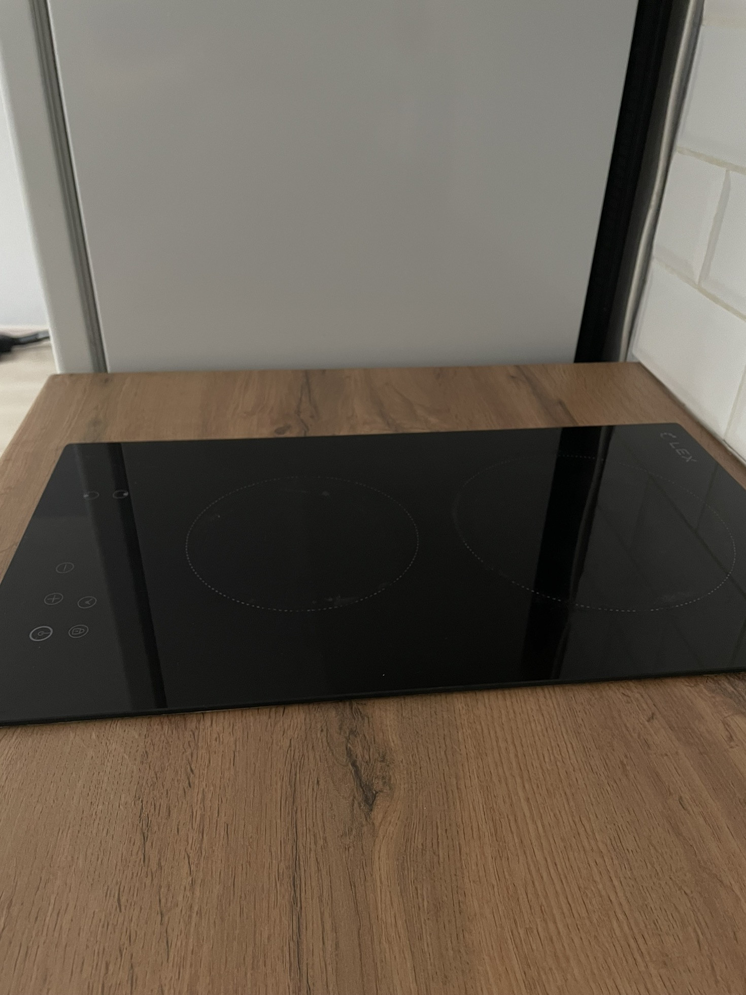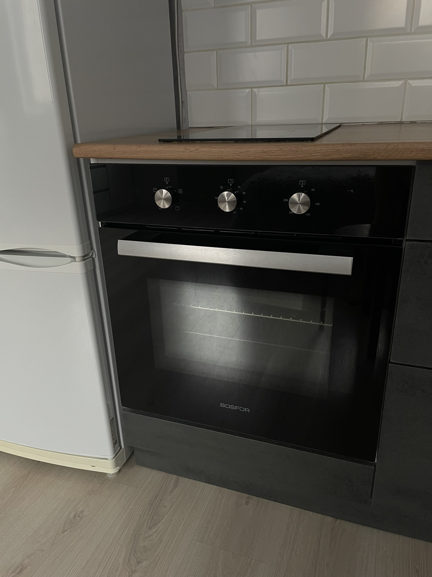 Установлен кухонный гарнитур в стиле лофт с фартуком из керамической плитки. Встроена вытяжка, варочная панель и духовой шкаф.