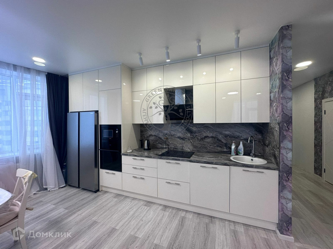 В квартире выполнен дизайнерский ремонт из качественных дорогостоящих материалов. В квартире две изолированные комнаты, большая светлая кухня-гoстиная с панорамным остеклением, два раздельных санузла с подогревом пола, просторный коридор. В обеих комнатах есть выход на лоджию с панорамным остеклением. Показания счетчиков горячей и холодной воды передаются автоматически.