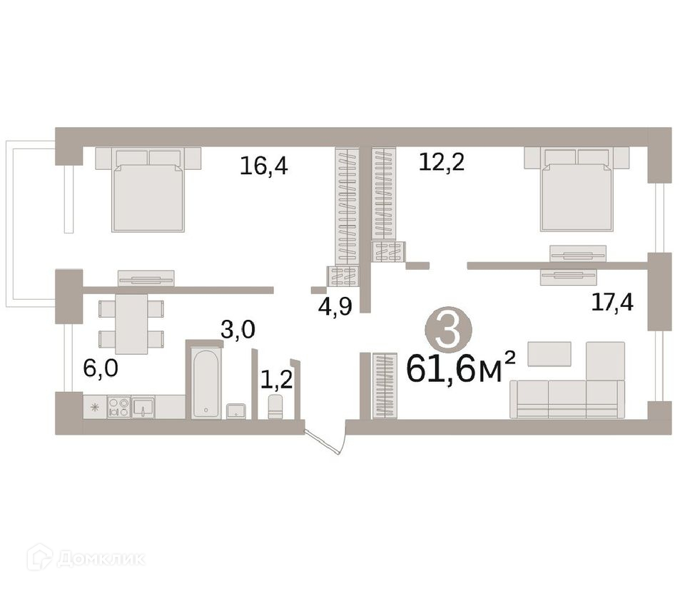 Общая площадь 61.6 м2