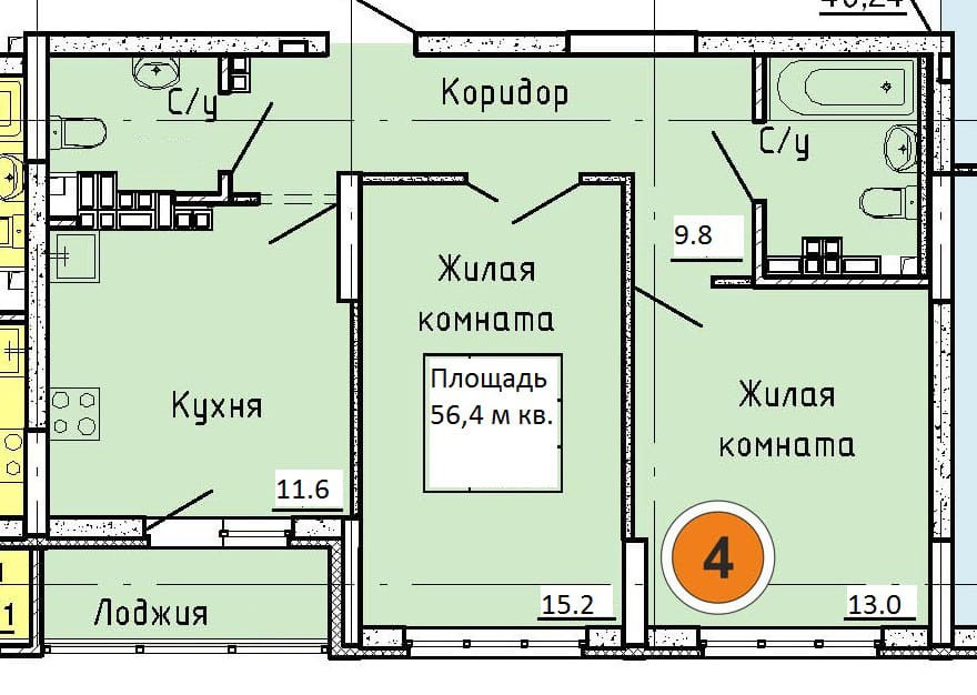 Общая площадь 56.4 м2