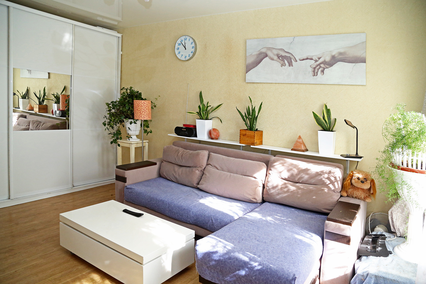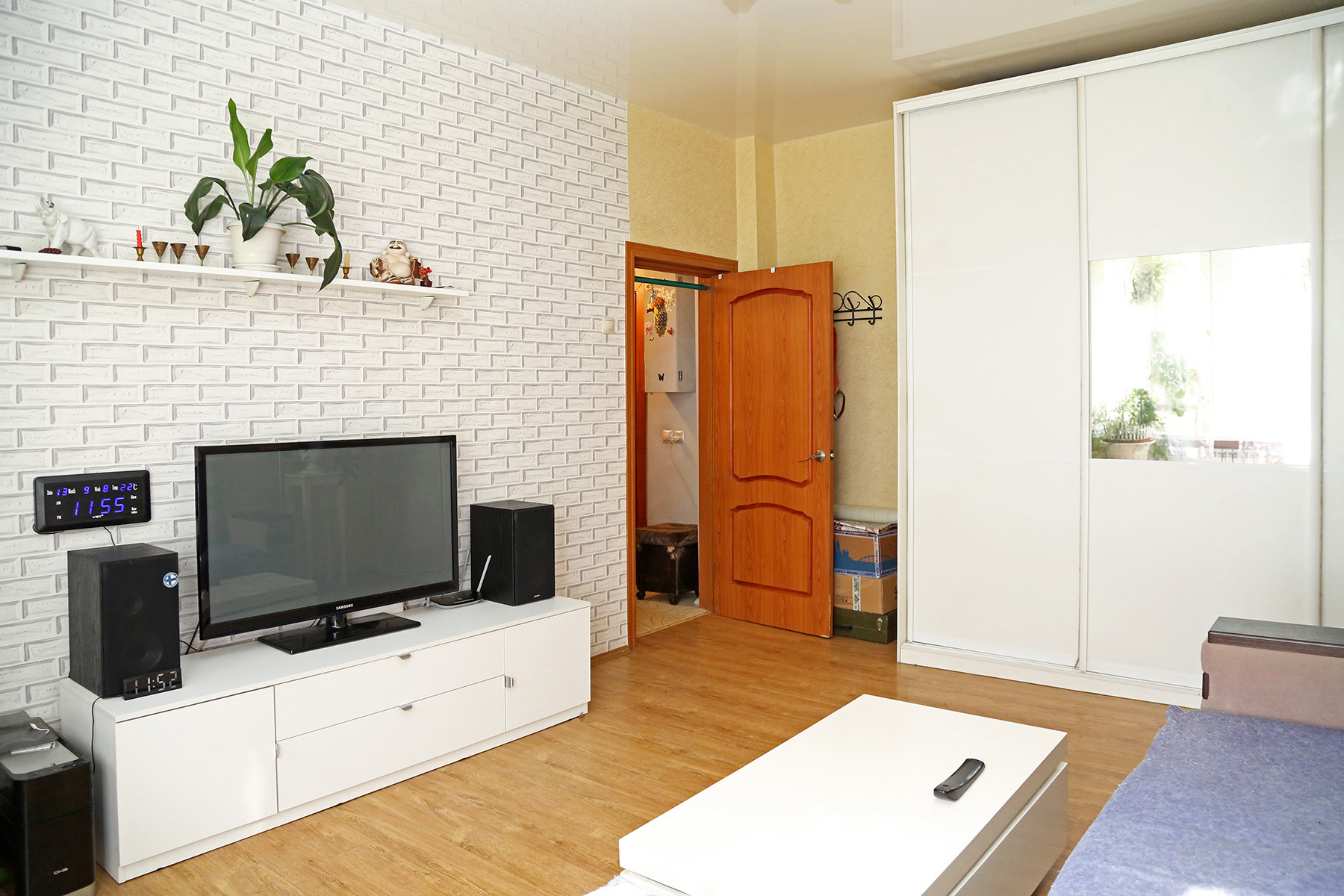 Дизайн квартиры выполнен в светлых тонах, что позволит выбрать любой цвет текстиля в интерьере.