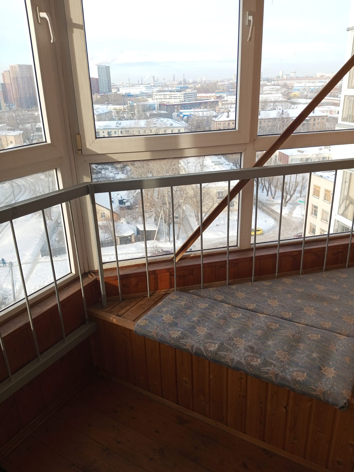На балконе стены и пол утеплены, обшиты вагонкой, есть место для хранения.