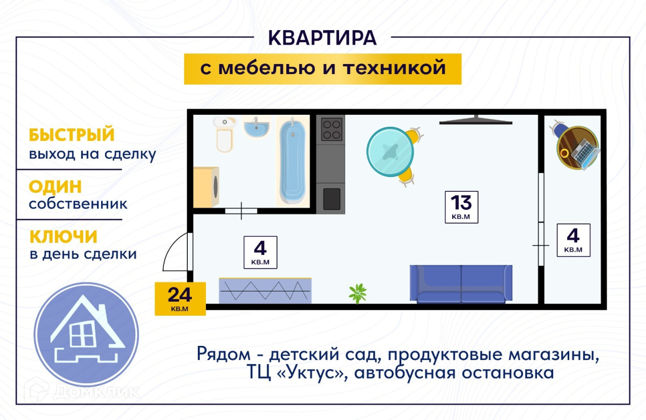 Квартира без обременений и долгов. Один взрослый собственник с момента постройки дома.