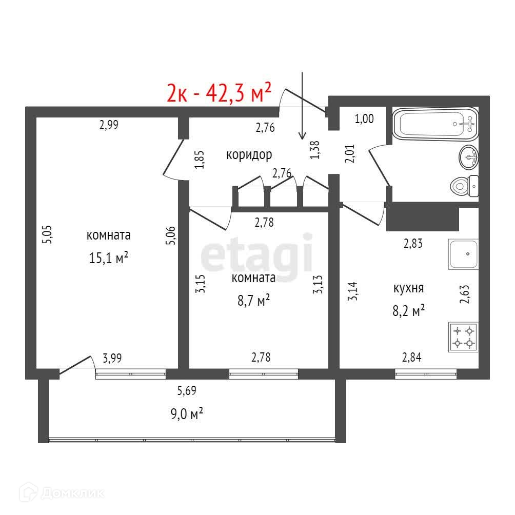 Общая площадь 42.3 м2