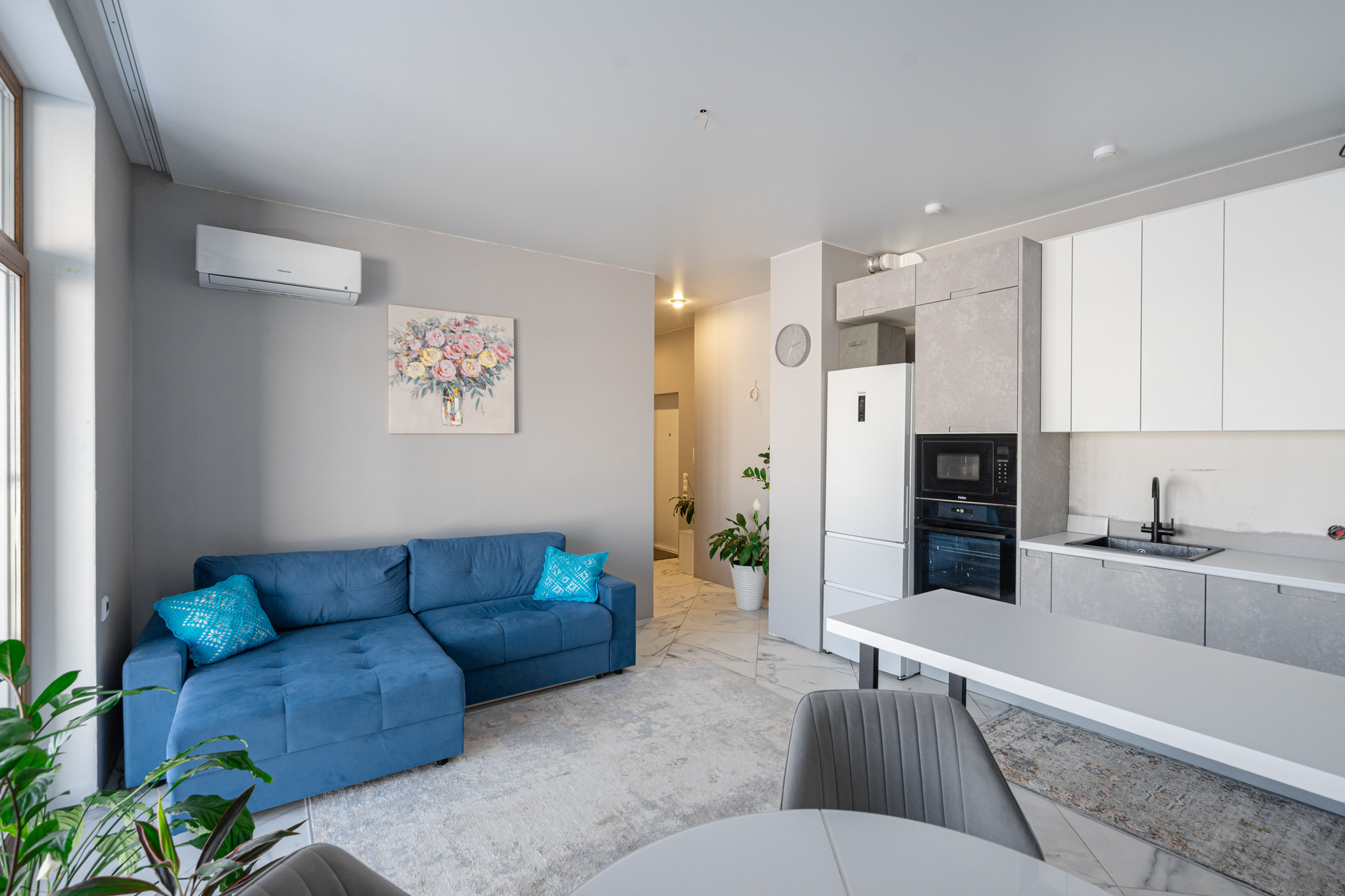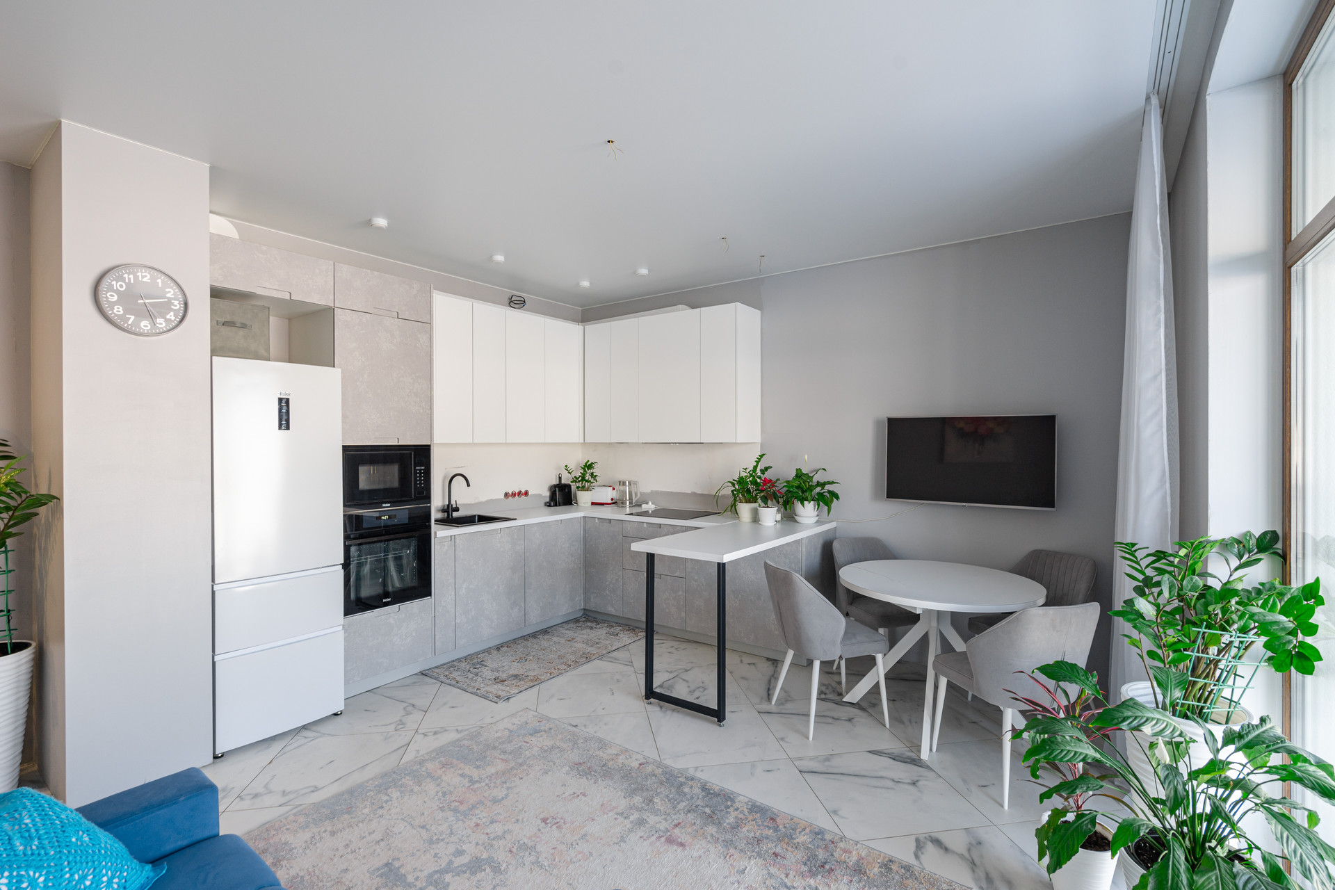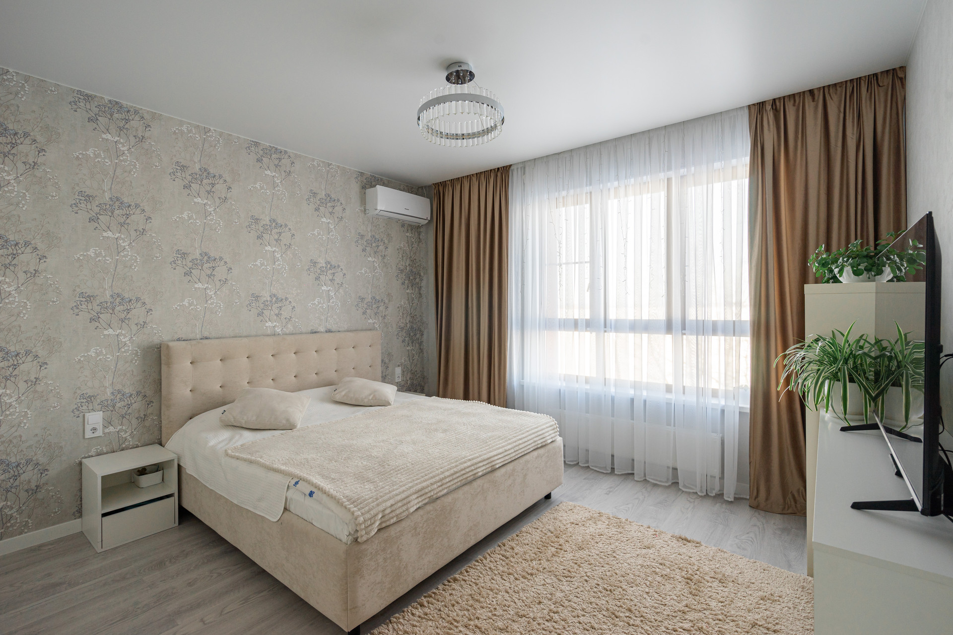 Высота потолков 2,9 м, перепланировок не было. В квартире большая кухня с гостиной, две спальни, два санузла, большая прихожая, лоджия и гардеробная. Из спален вид на пруд, остров и уральские холмы. Из мебели остается все: кухня, техника Haier, посудомоечная машина, стиральная машина, микроволновка, духовой шкаф, холодильник. Северная сторона: зимой тепло, летом не жарко