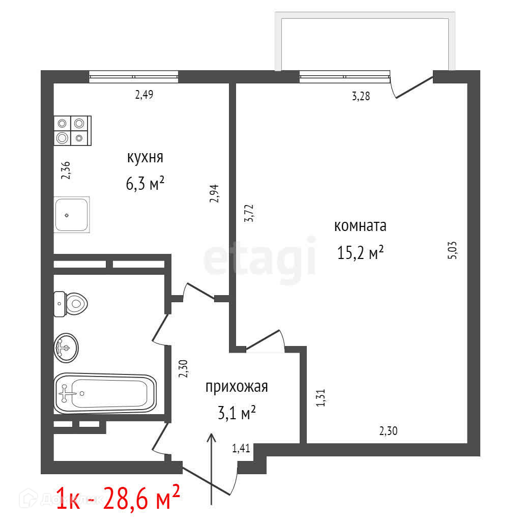 Общая площадь 28.6 м2