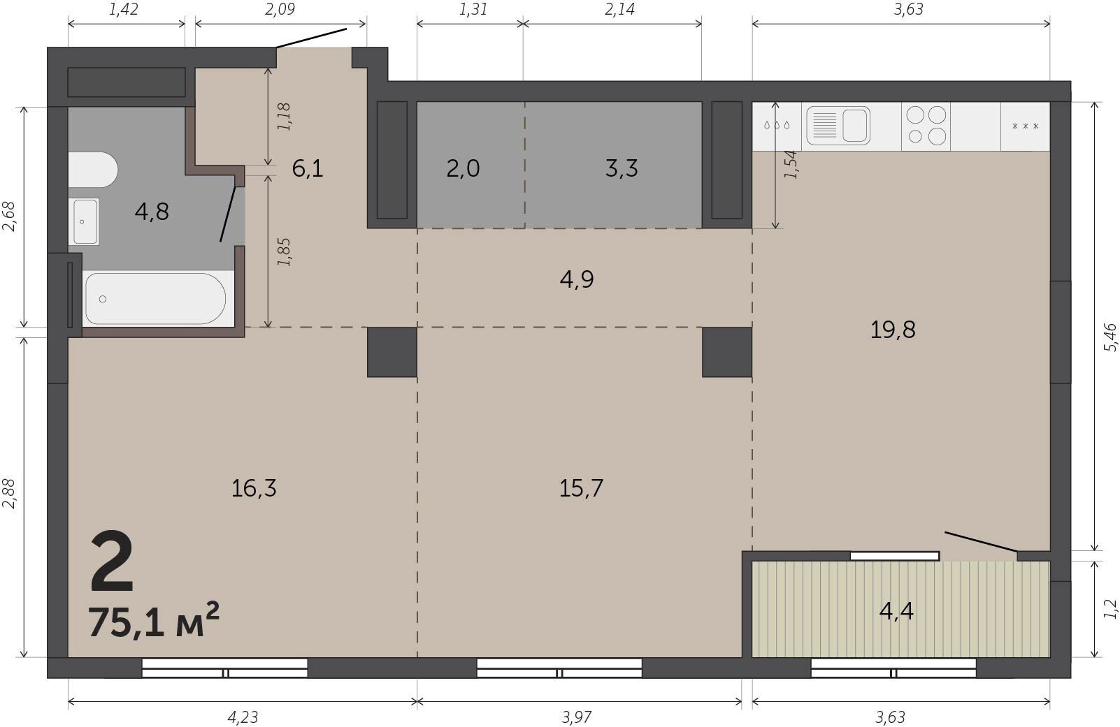 Общая площадь 75.1 м2