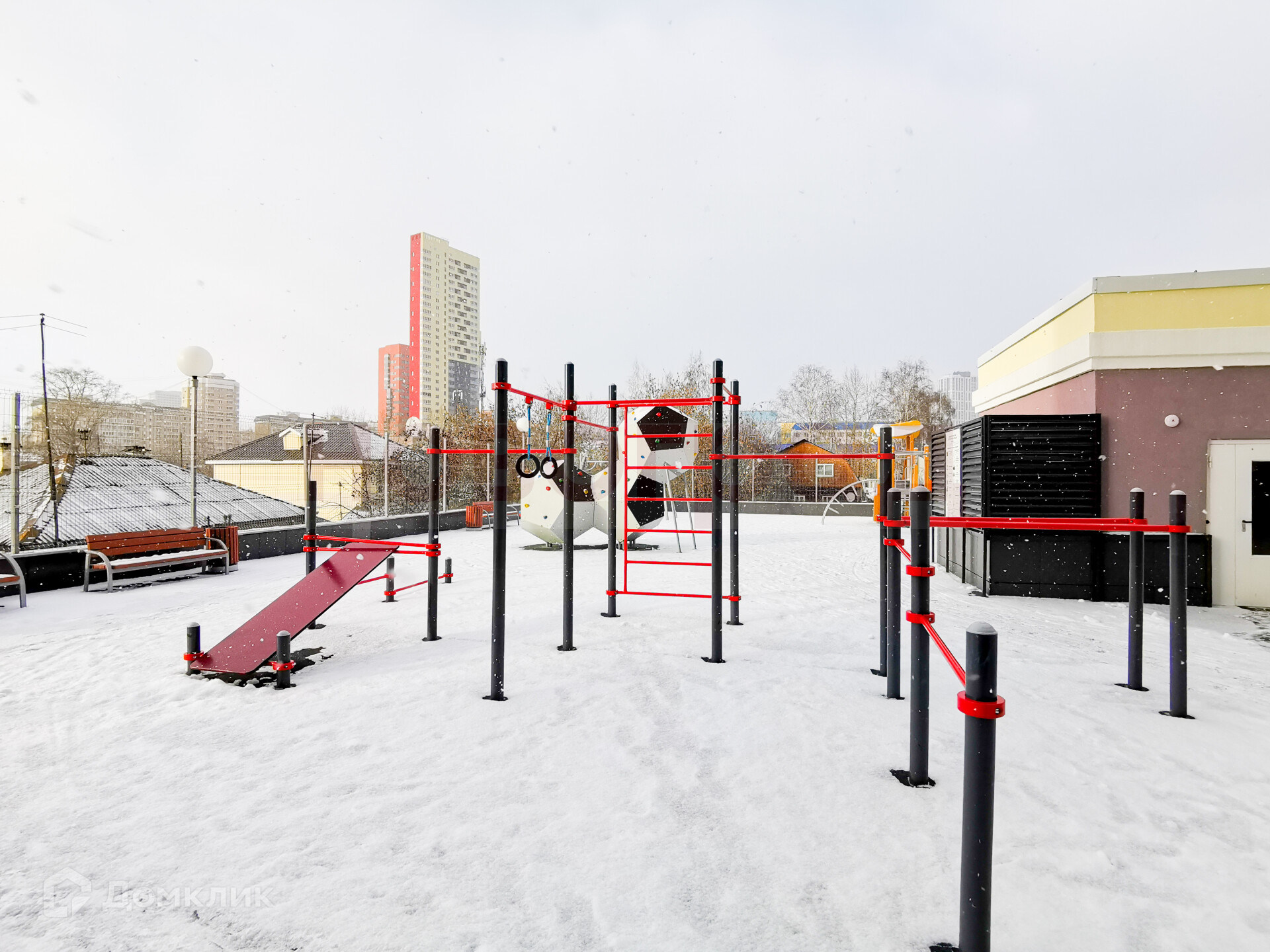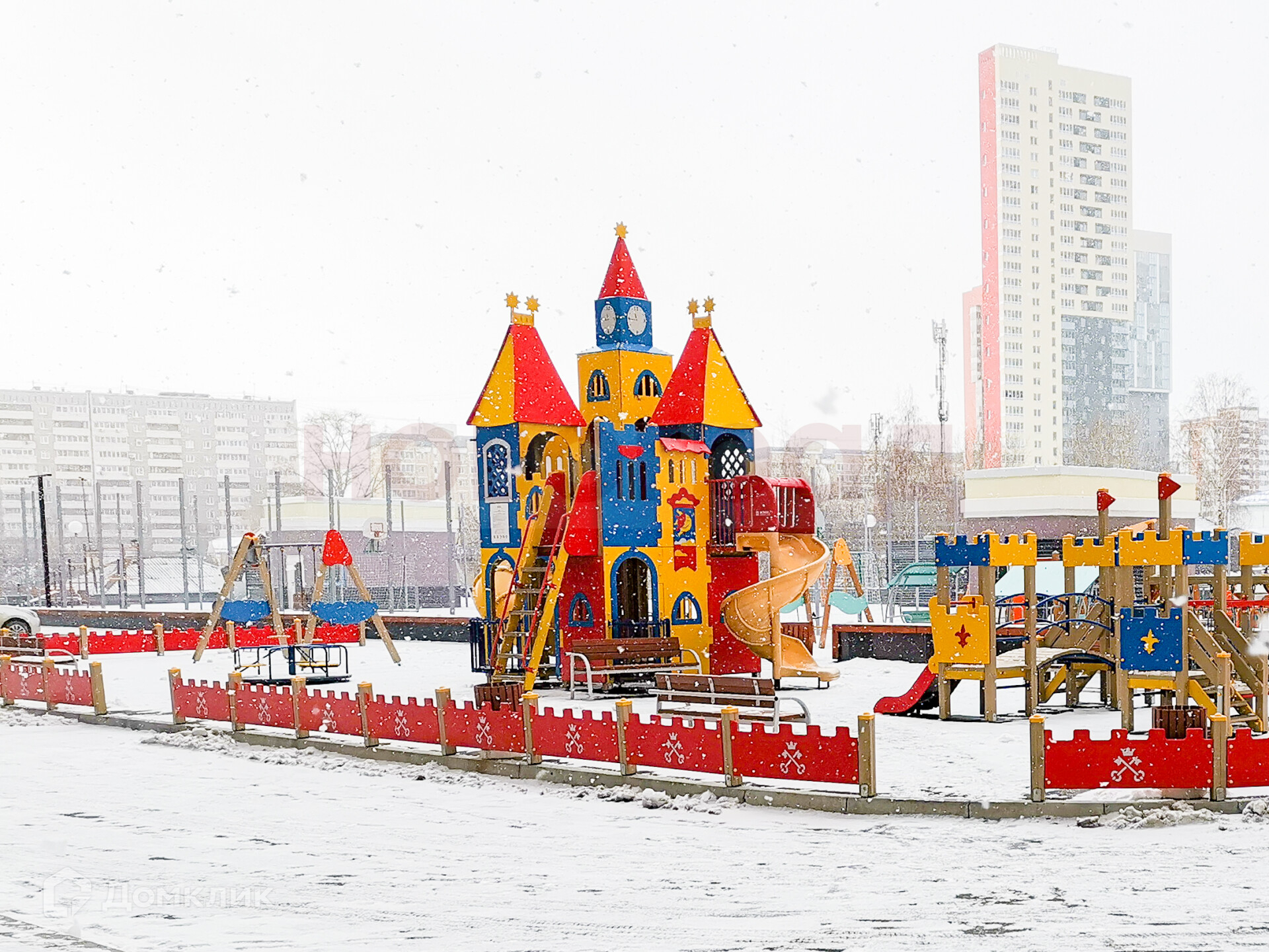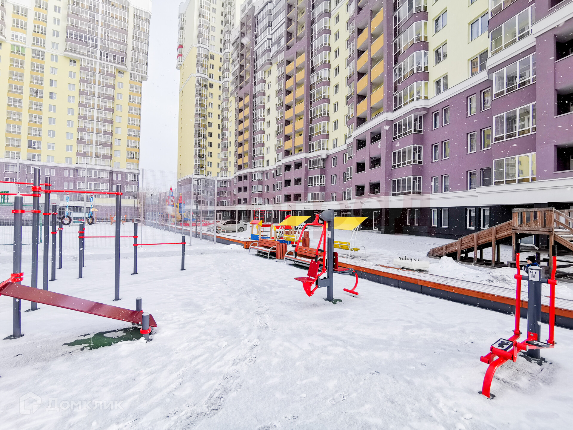 Двор не только безопасный, но и большой и зелёный. Во дворе размещена масса сооружений для малышей и ребят постарше: песочницы, качели и карусели, детские домики и горки. Все комплексы разработаны компанией KSIL, признанным лидером в производстве оборудования для детских площадок. Комплексы комфортны и безопасны, во дворе травма-безопасное покрытие.