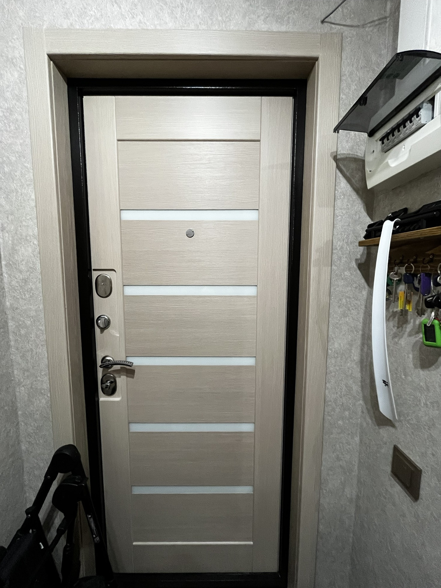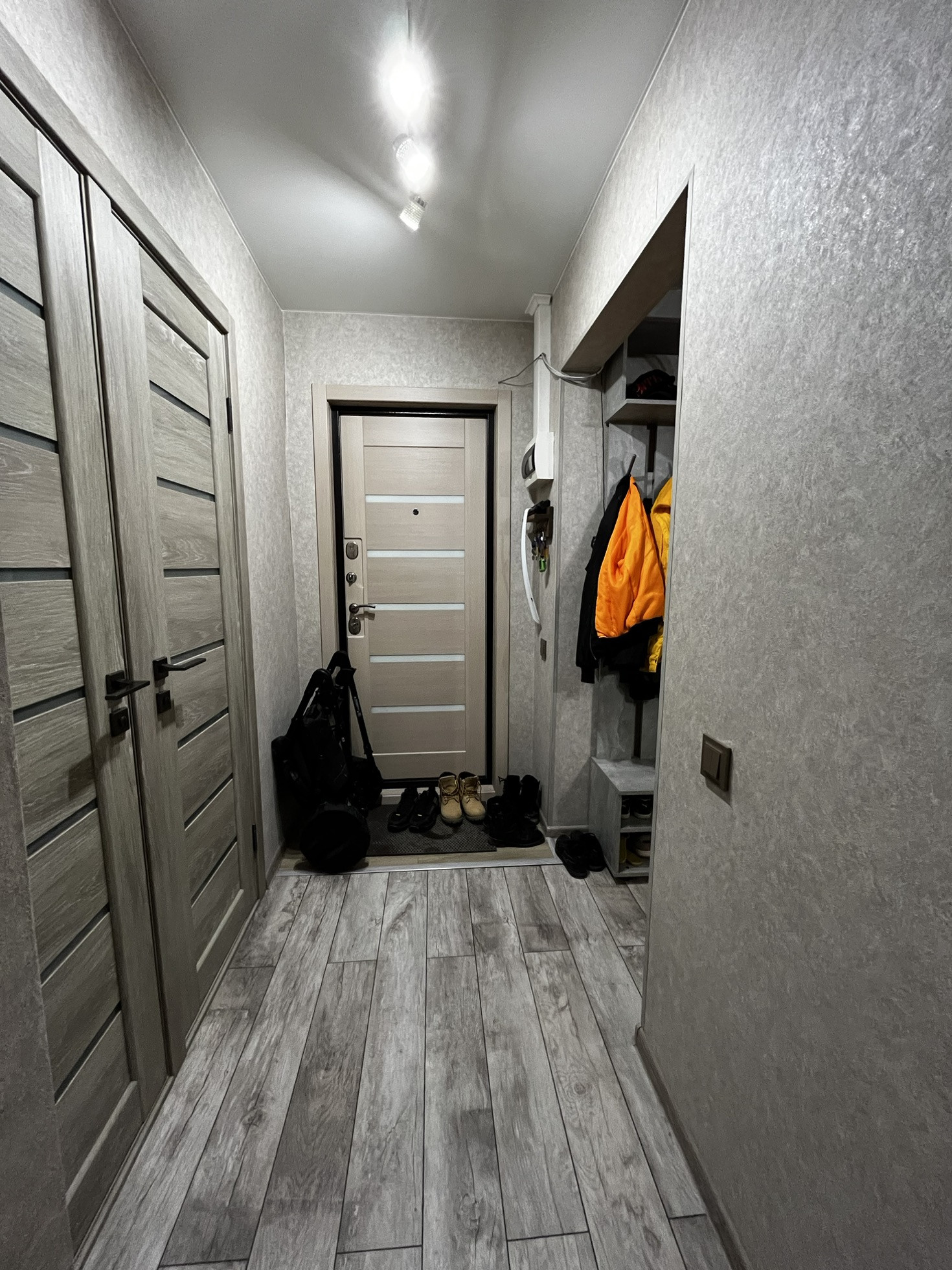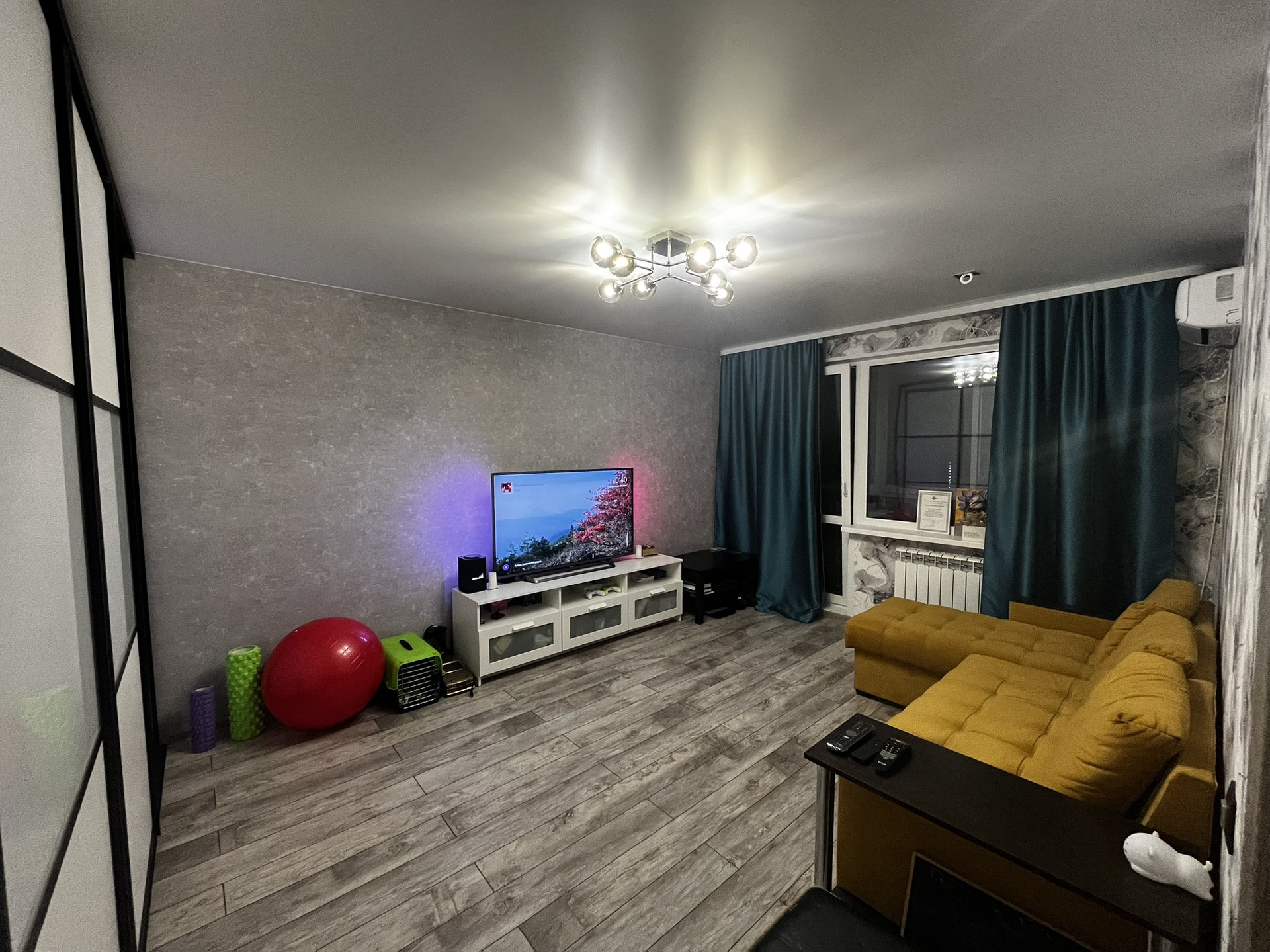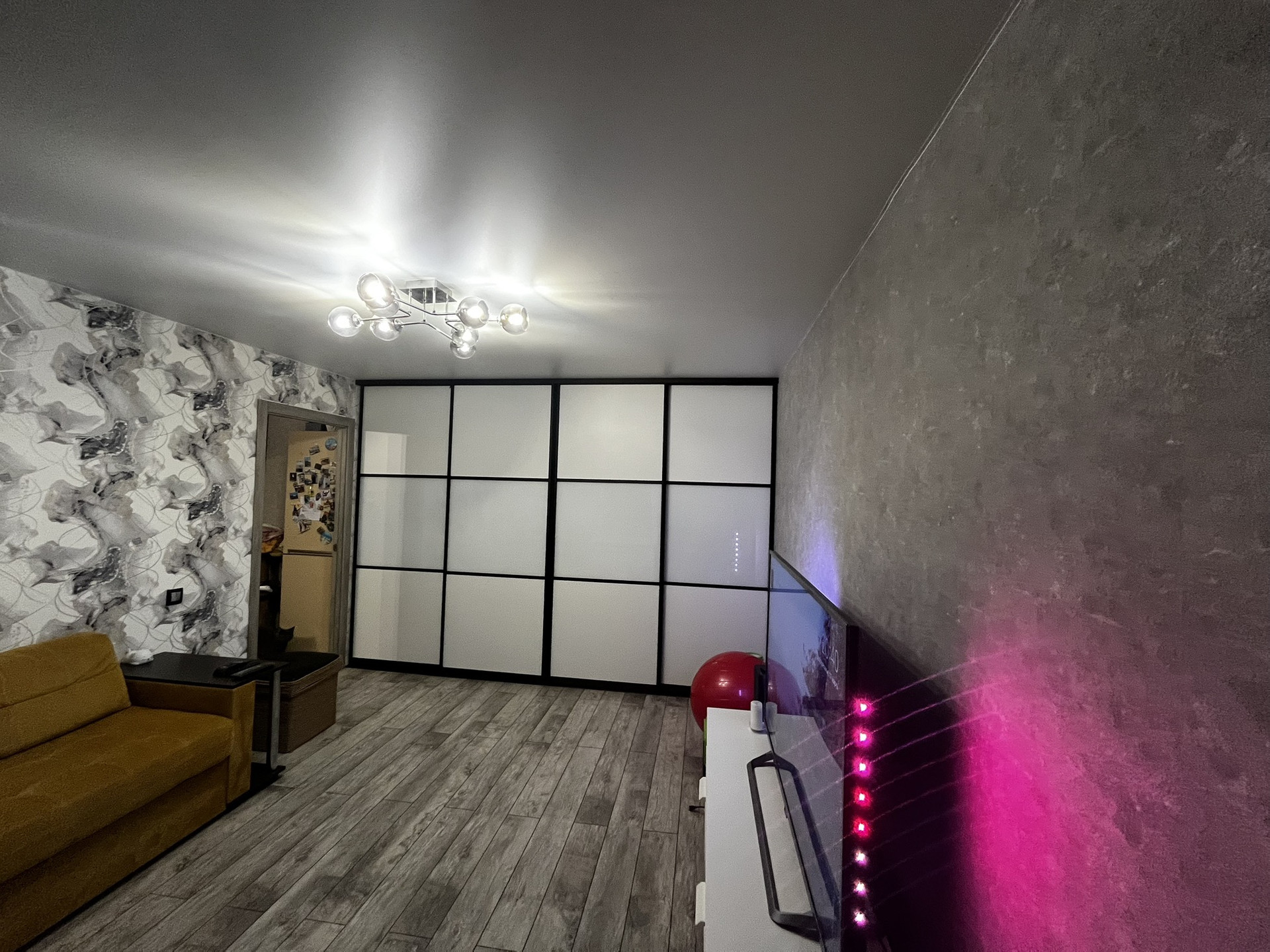В гостиной расположена большая гардеробная система с раздвижными дверями-купе и с подсветкой внутри,в прошлом году был установлен кондиционер.