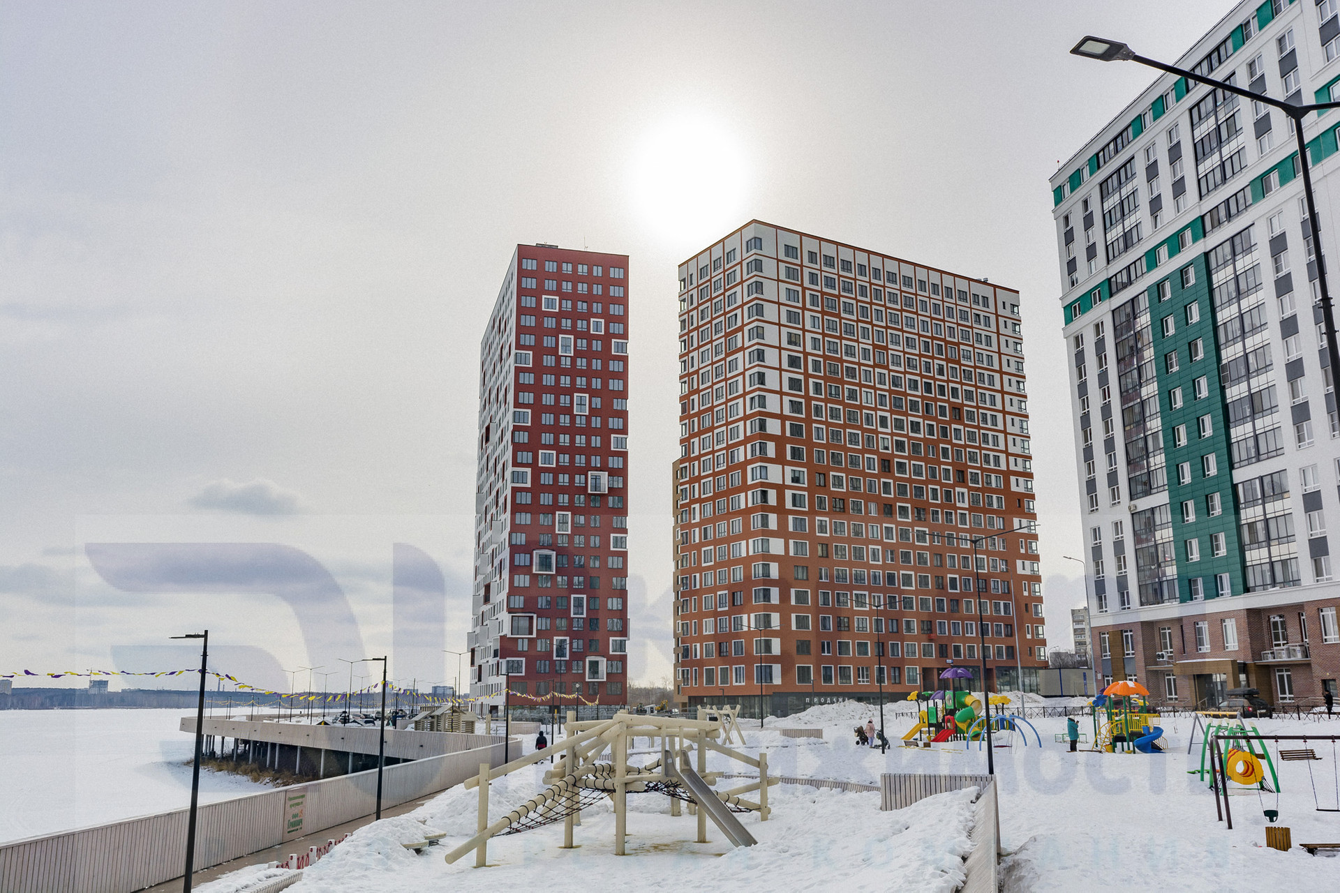 В доме установлены видео камеры, закрытая территория двора, есть детская площадка, большая благоустроенная набережная, где вы можете прогуляться в любое время года, есть фонтан, амфитеатр с выходом к воде, футбольная и спортивная площадка с тренажерами для занятий спортом.