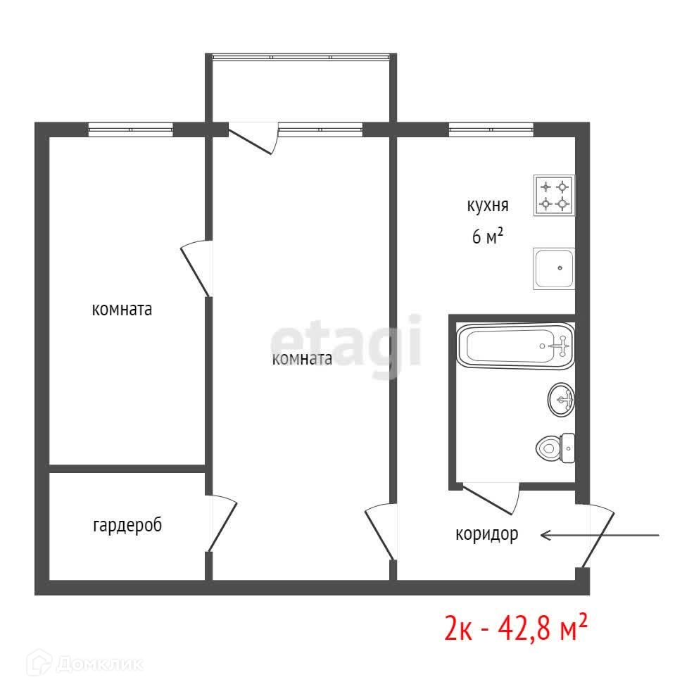 Общая площадь 42.8 м2