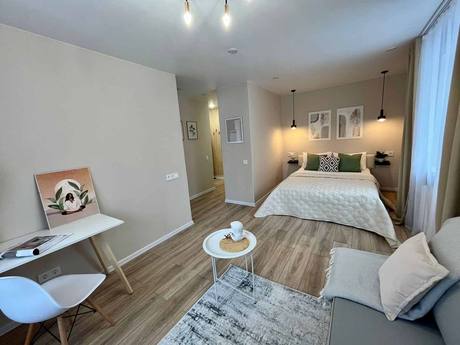 Сделан качественный ремонт под руководством дизайнера из премиальных материалов.Проведено зонирование пространства -отдельная зона отдыха с двуспальной кроватью для комфортного сна.