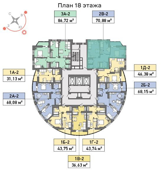 Общая площадь квартиры 70,88 кв.м., при входе расположен просторная прихожая – 13,16 кв.м., гардеробное помещение, в квартире имеется два раздельных санузла. Кухня-гостиная – 19,15 кв.м., в которой удобно смогут расположиться все члены семьи, две спальни- 11,7 кв.м. и 14,97 кв.м. с лоджией- 4,21 кв.м.