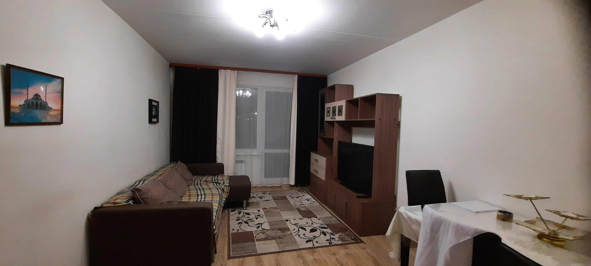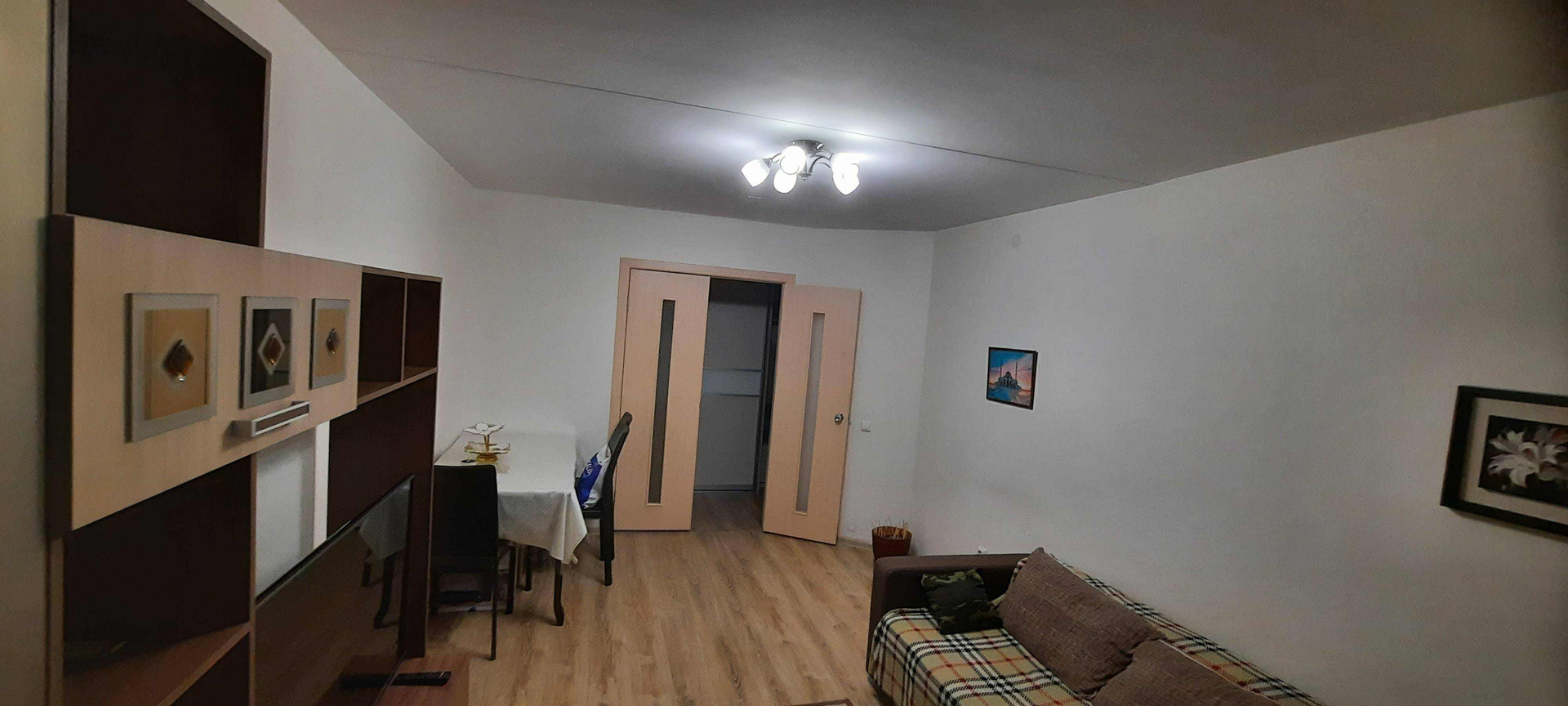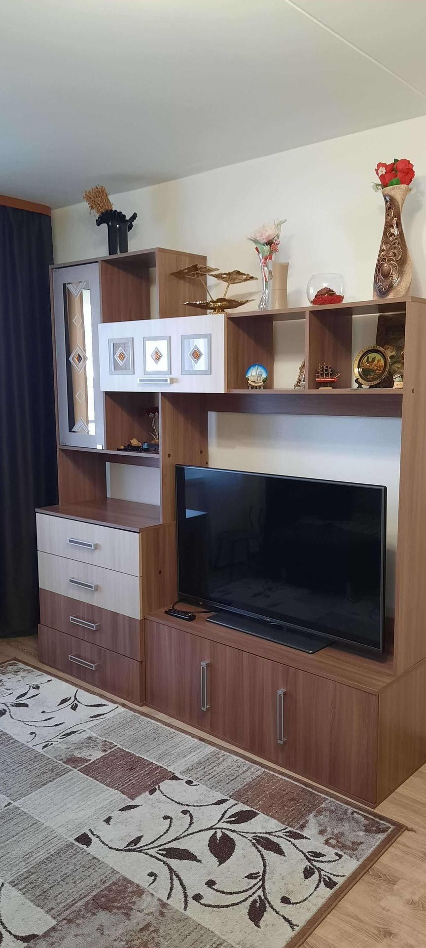 Удобная планировка. Комнаты раздельные с натяжными потолками - 14,4 кв.м, 11,7 кв.м., меблированы - в них остаются кровати, шкафы, письменный стол со шкафом, гостиная - 16,7 кв. м. - со стенкой.