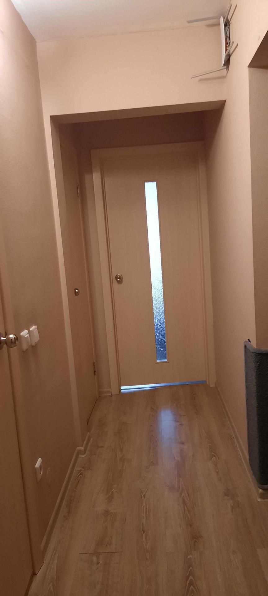 Просторный коридор (7,6 кв.м) со встроенным вместительным шкафом-купе. На кухне (9,6 кв.м) - кухонный гарнитур со встроенной техникой - варочной поверхностью и духовым шкафом Weissgauff, вытяжка. На лоджие - шкаф.