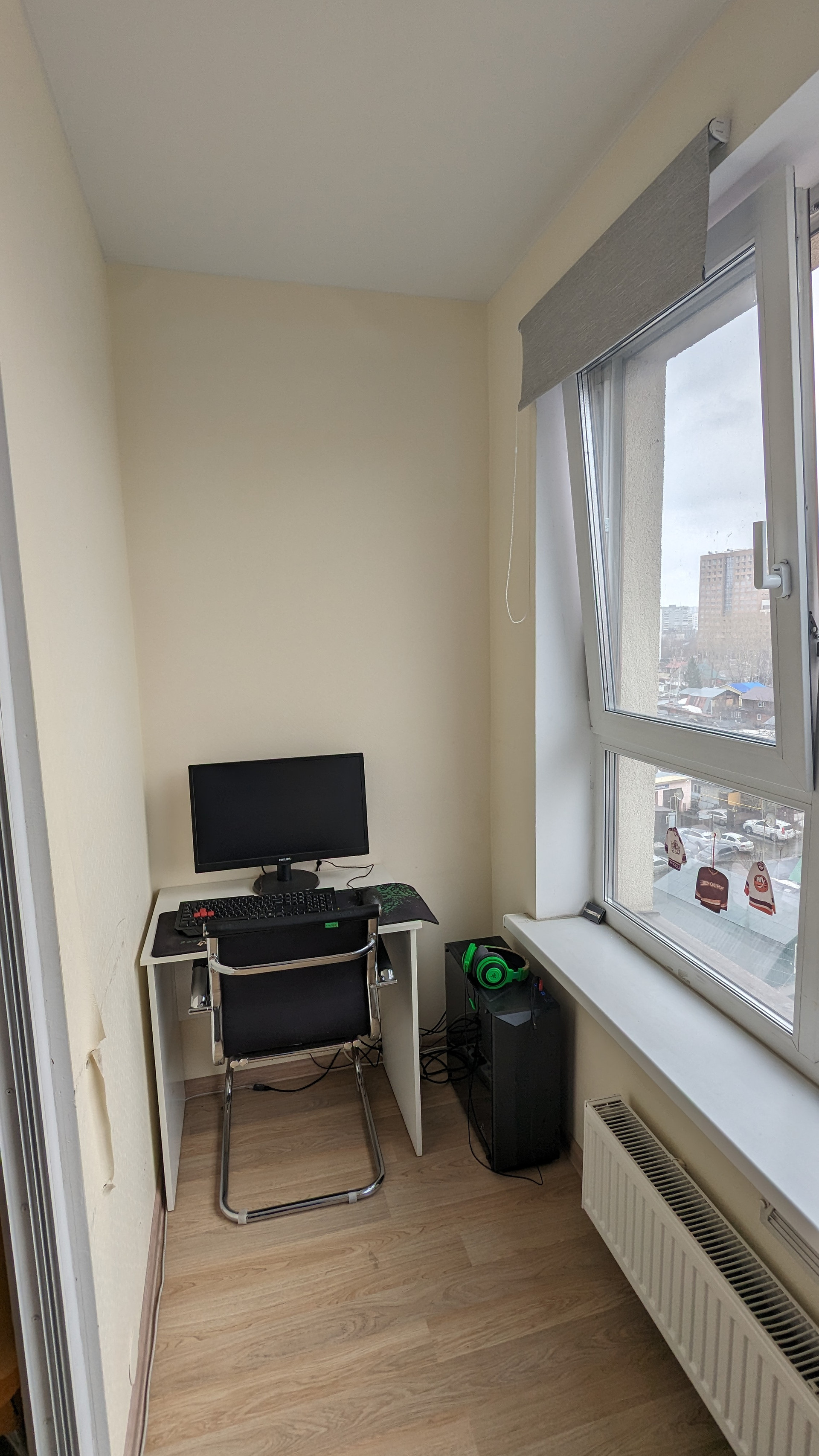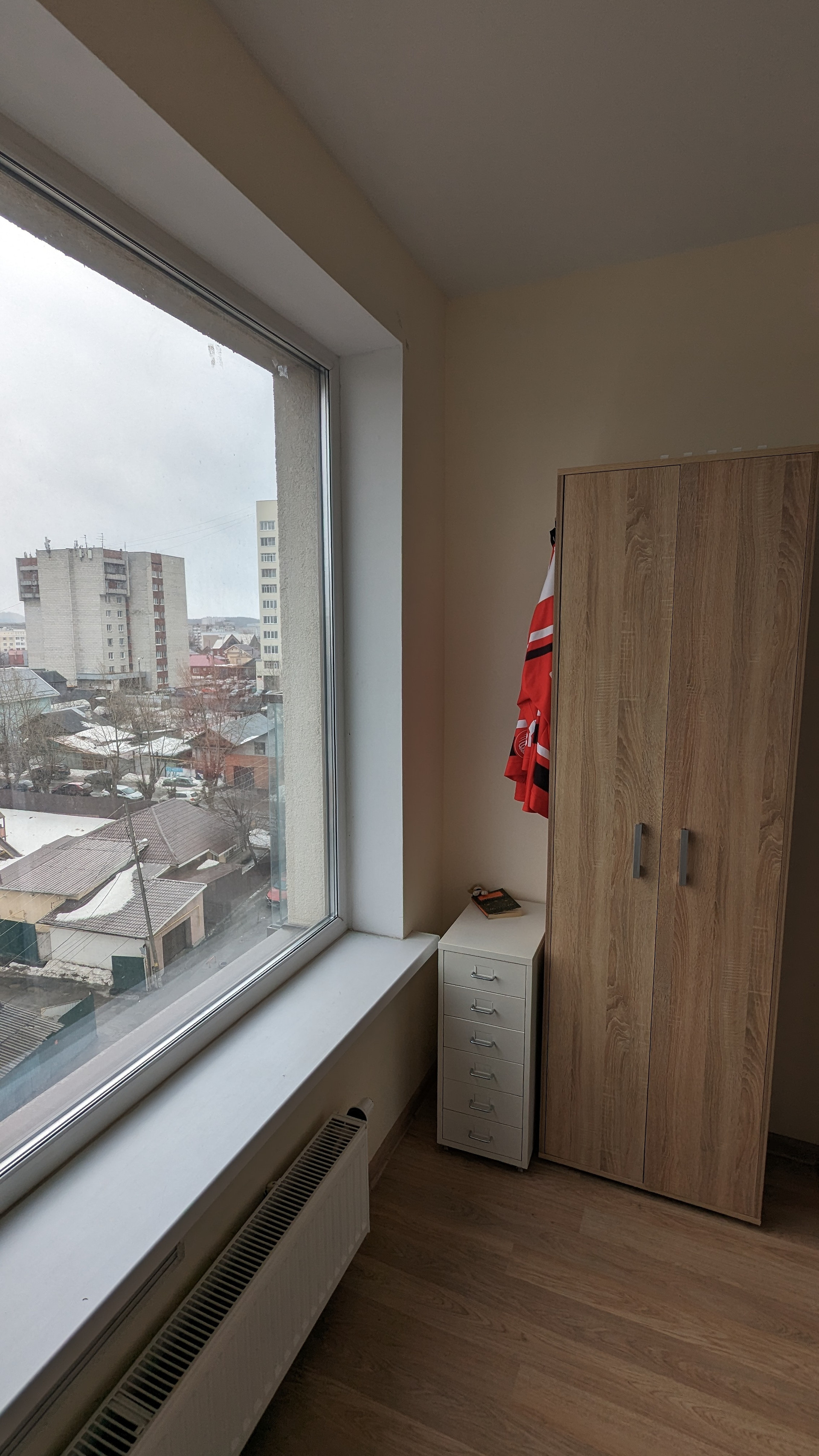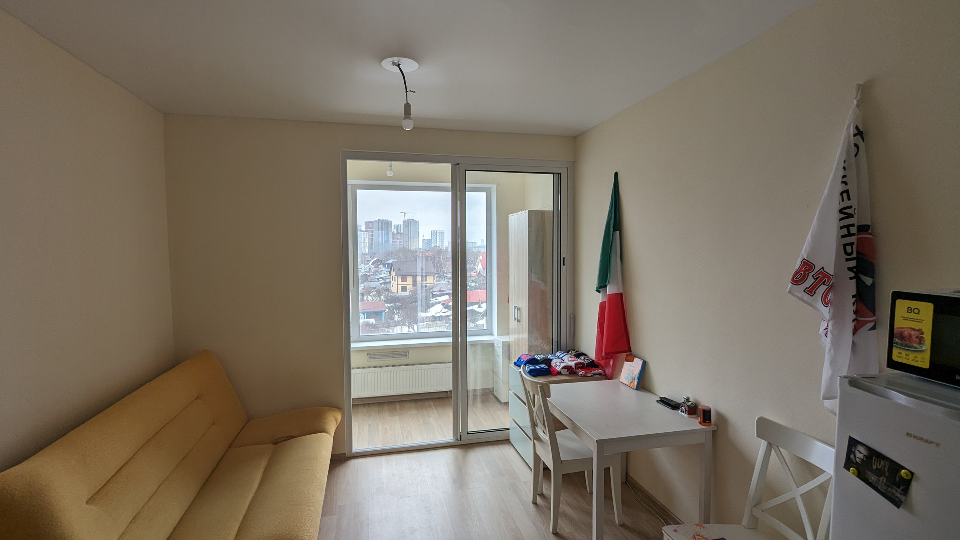 Панорамные окна обеспечивают естественное освещение и вид на город.