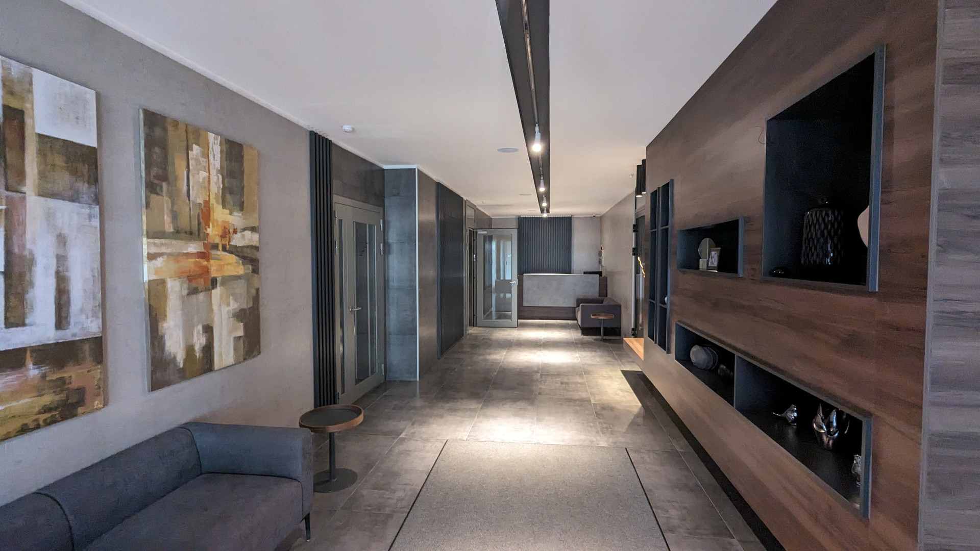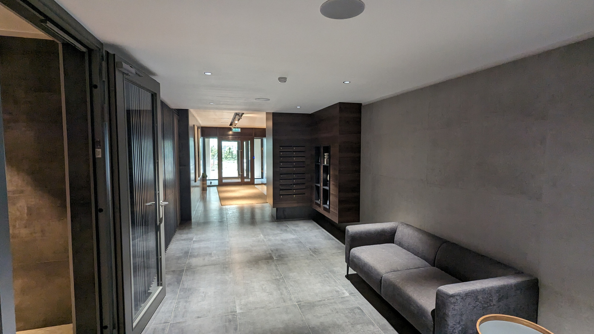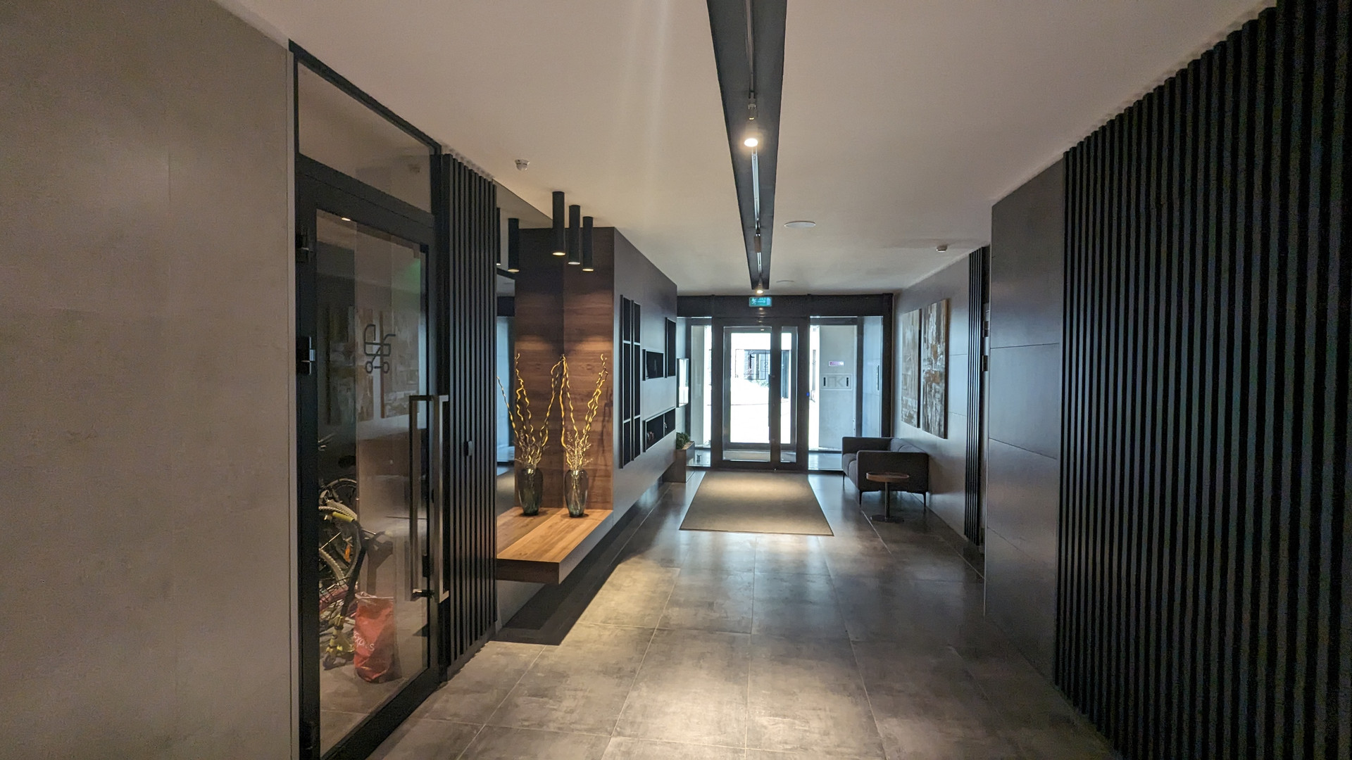 Панорамные окна обеспечивают естественное освещение и вид на город.