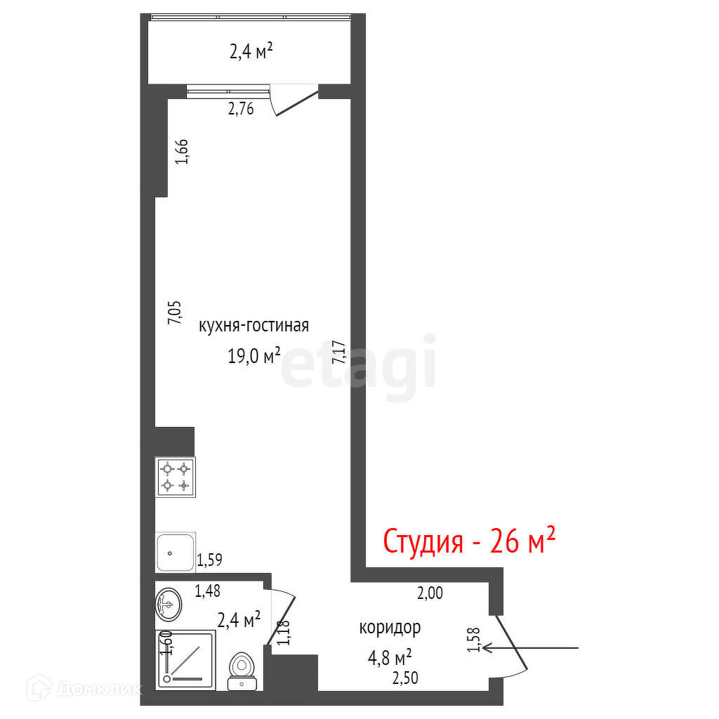 Общая площадь 29.4 м2
