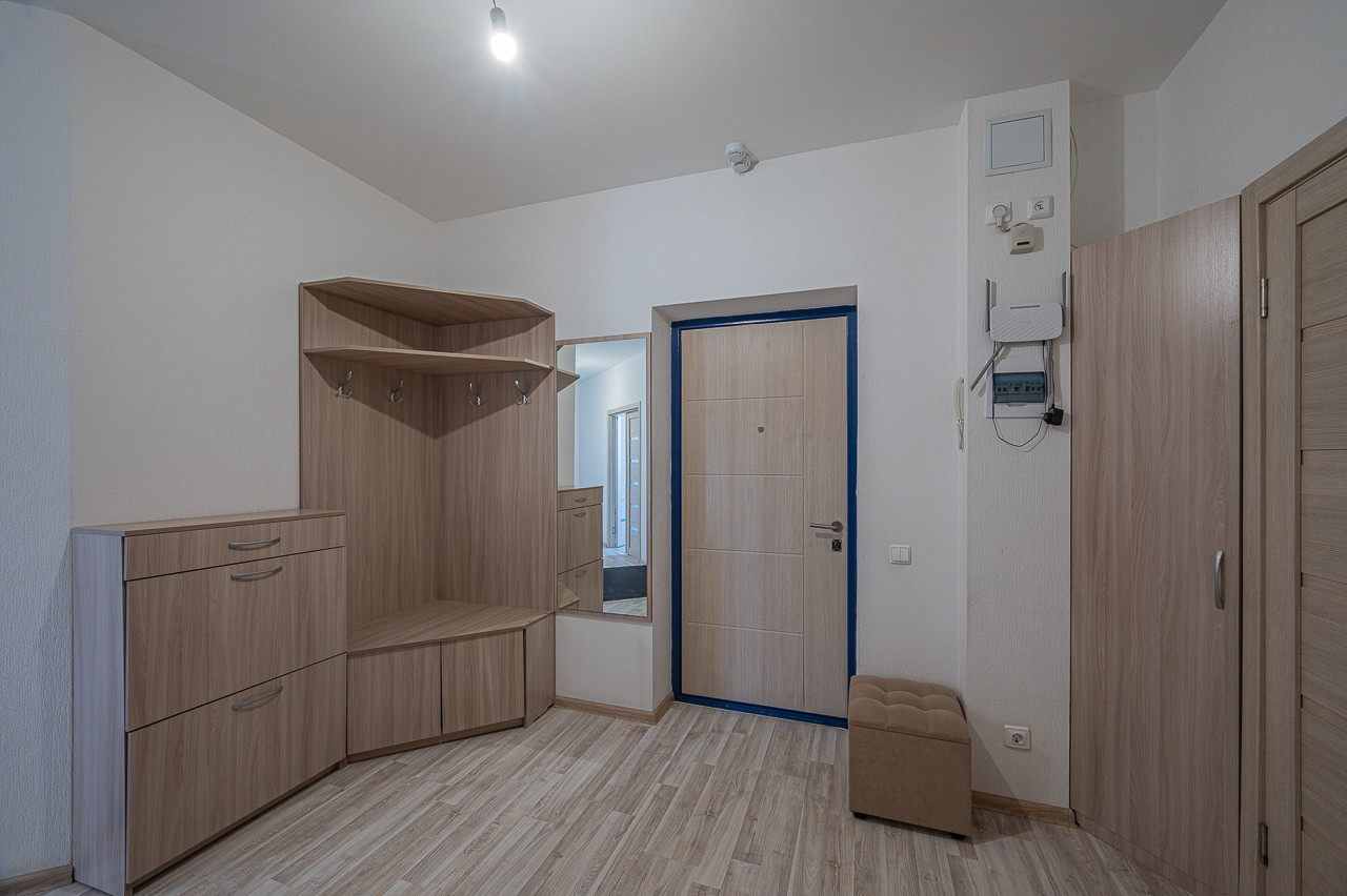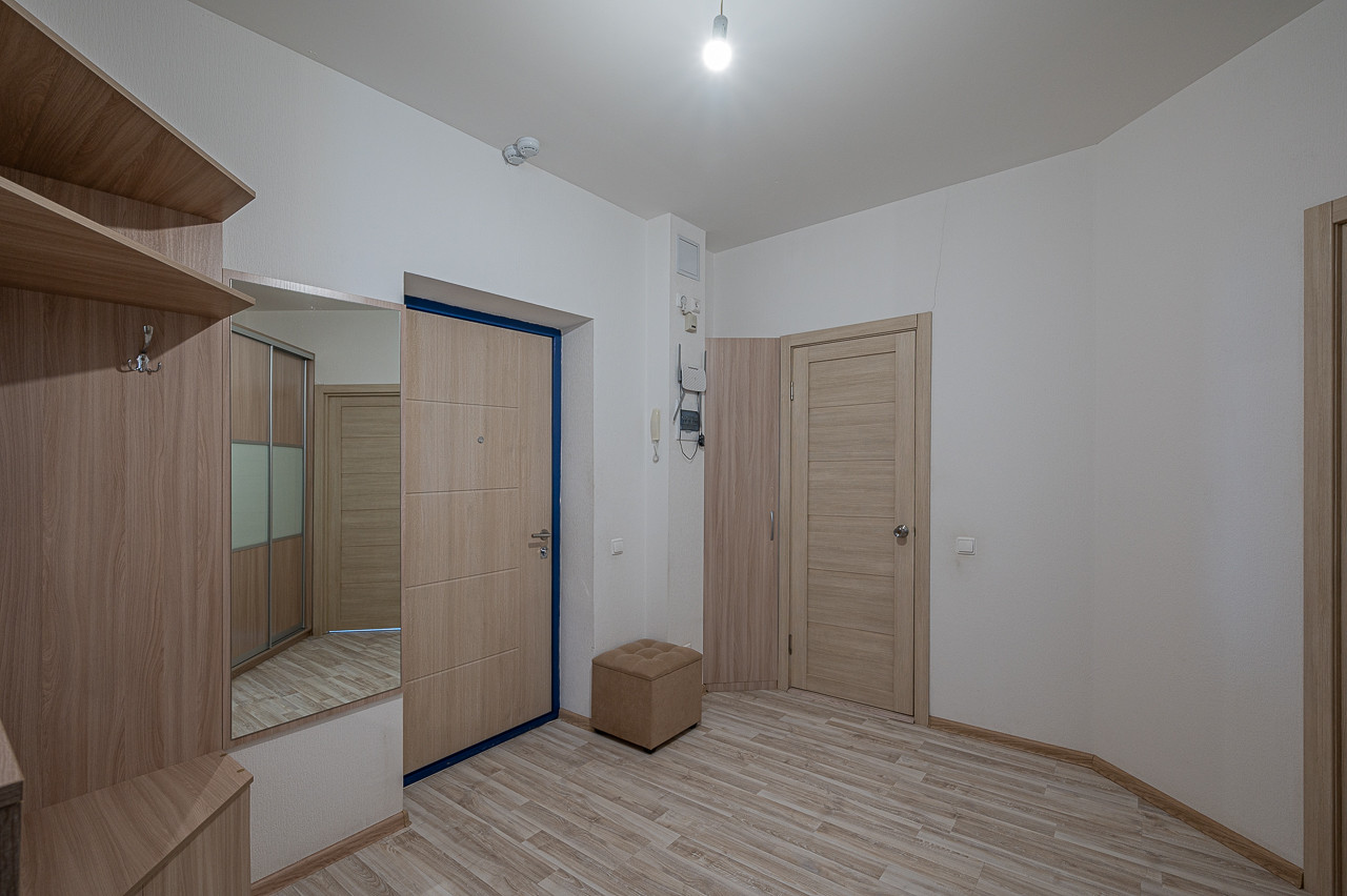 на входе в квартиру усиленная сейф-дверь, внутри — межкомнатные двери светлых тонов;
