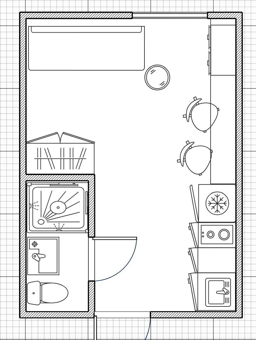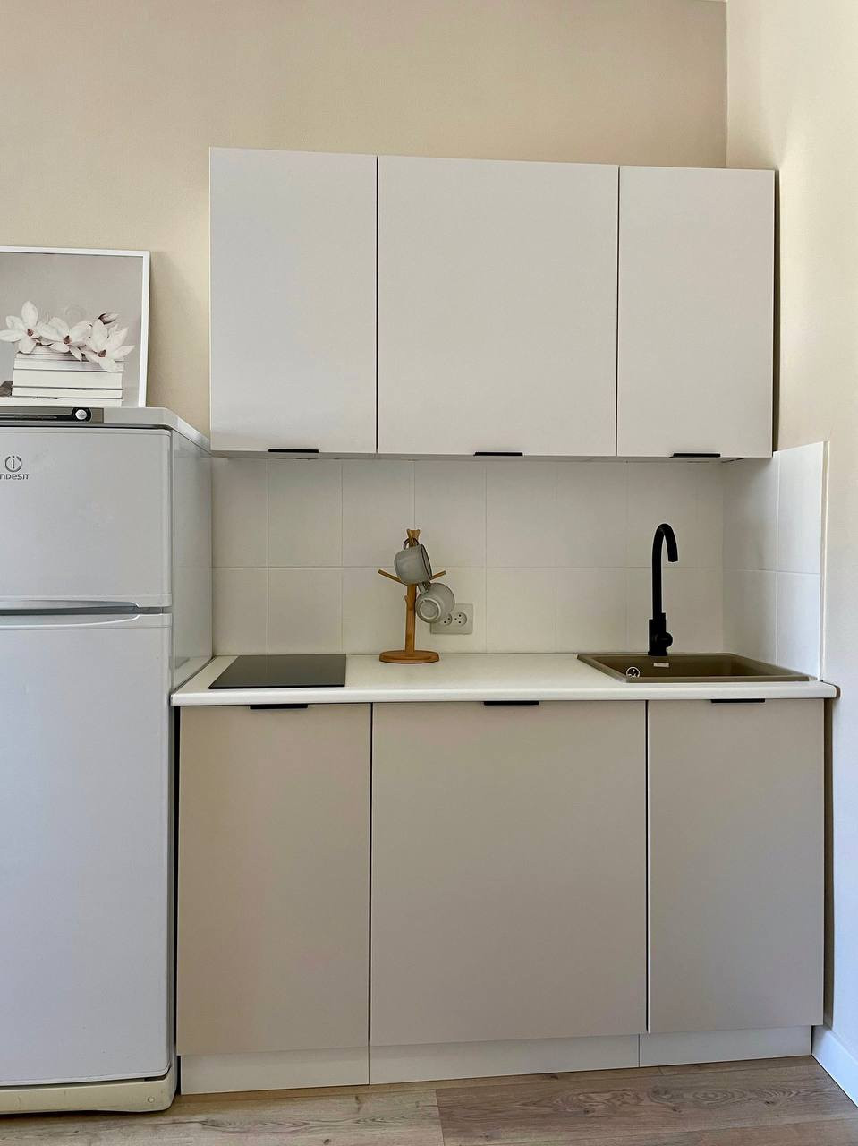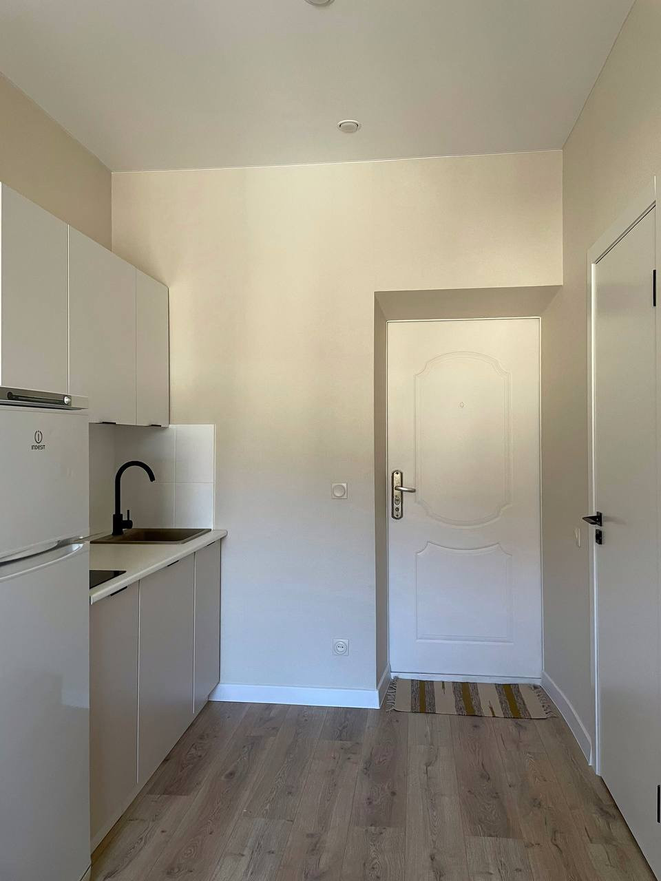 Заехать и жить можно без лишних вложений, так как в квартире есть все необходимое: кухонный гарнитур с варочной поверхностью, стиральная машина, холодильник, место для обеденной зоны и работы, шкаф для вещей, выдвижные ящики для хранения и диван.