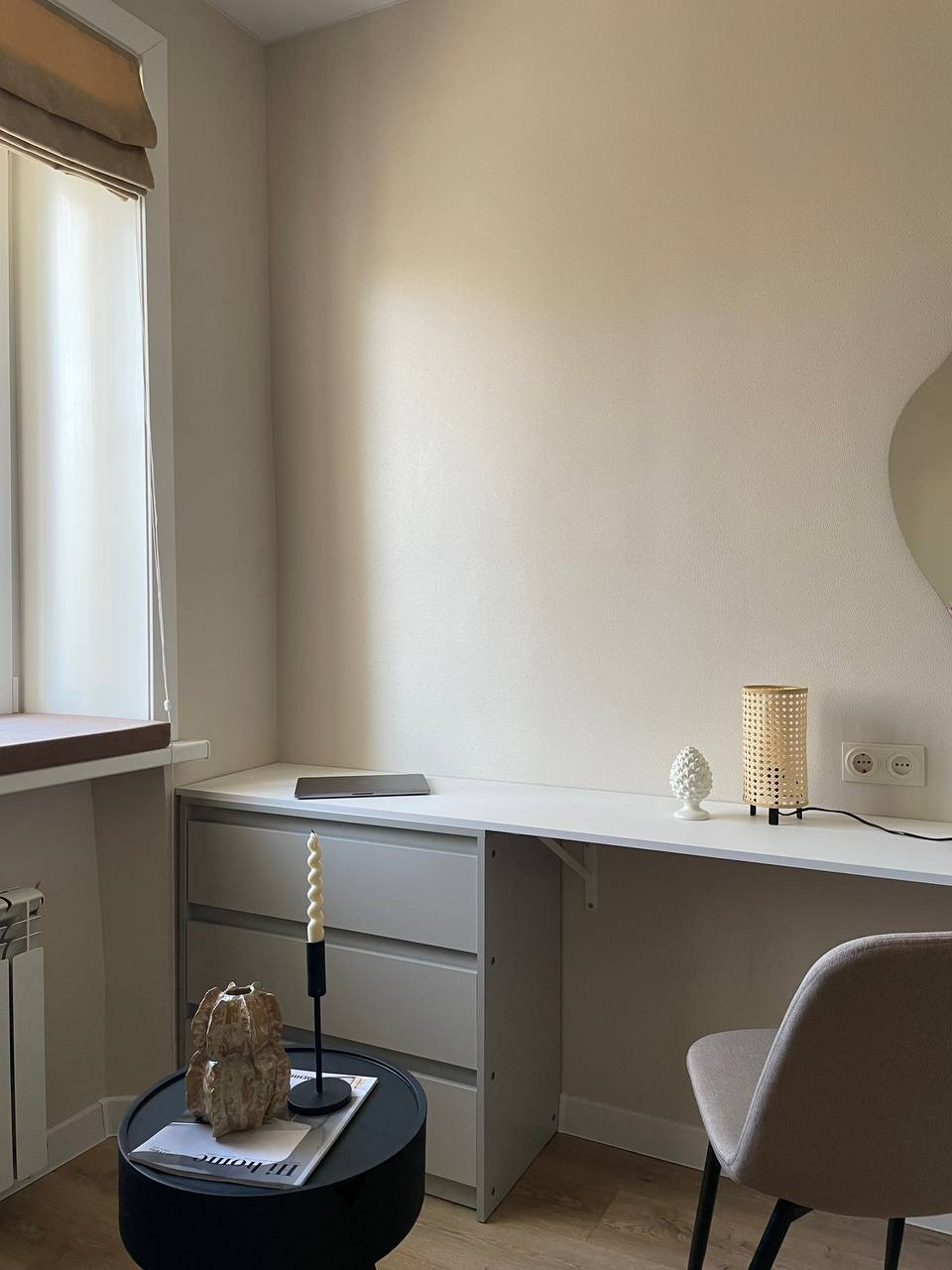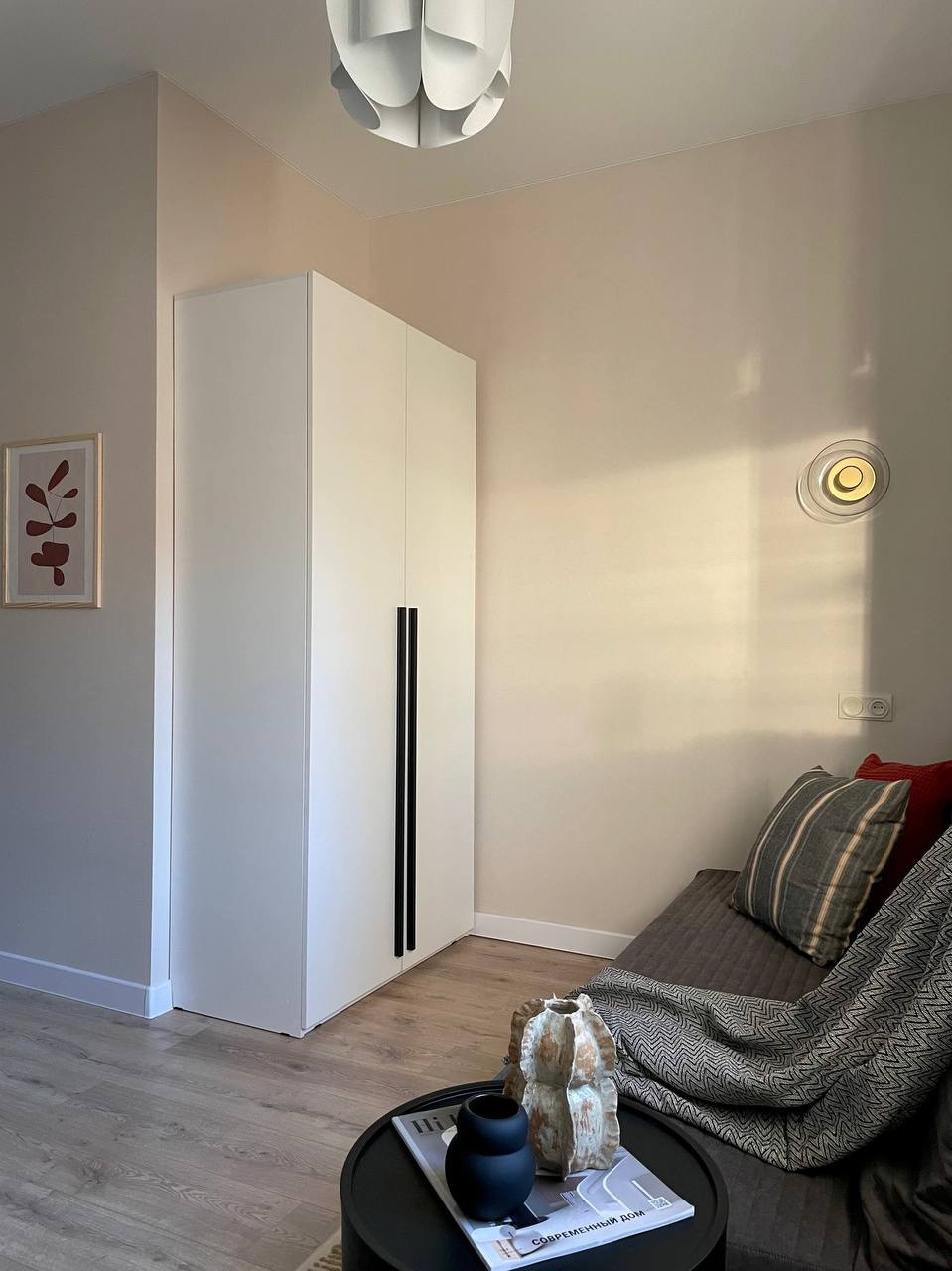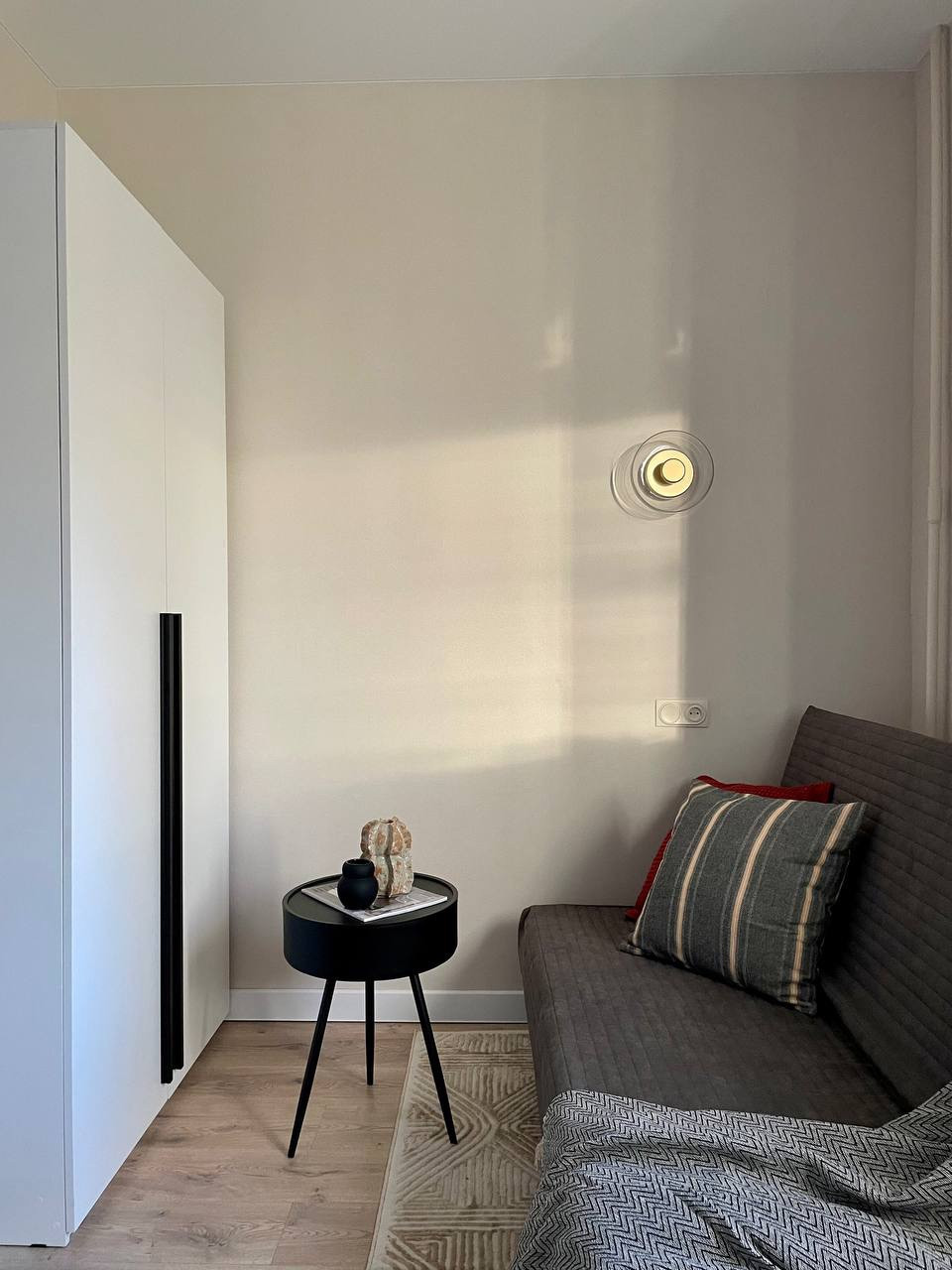 Заехать и жить можно без лишних вложений, так как в квартире есть все необходимое: кухонный гарнитур с варочной поверхностью, стиральная машина, холодильник, место для обеденной зоны и работы, шкаф для вещей, выдвижные ящики для хранения и диван.