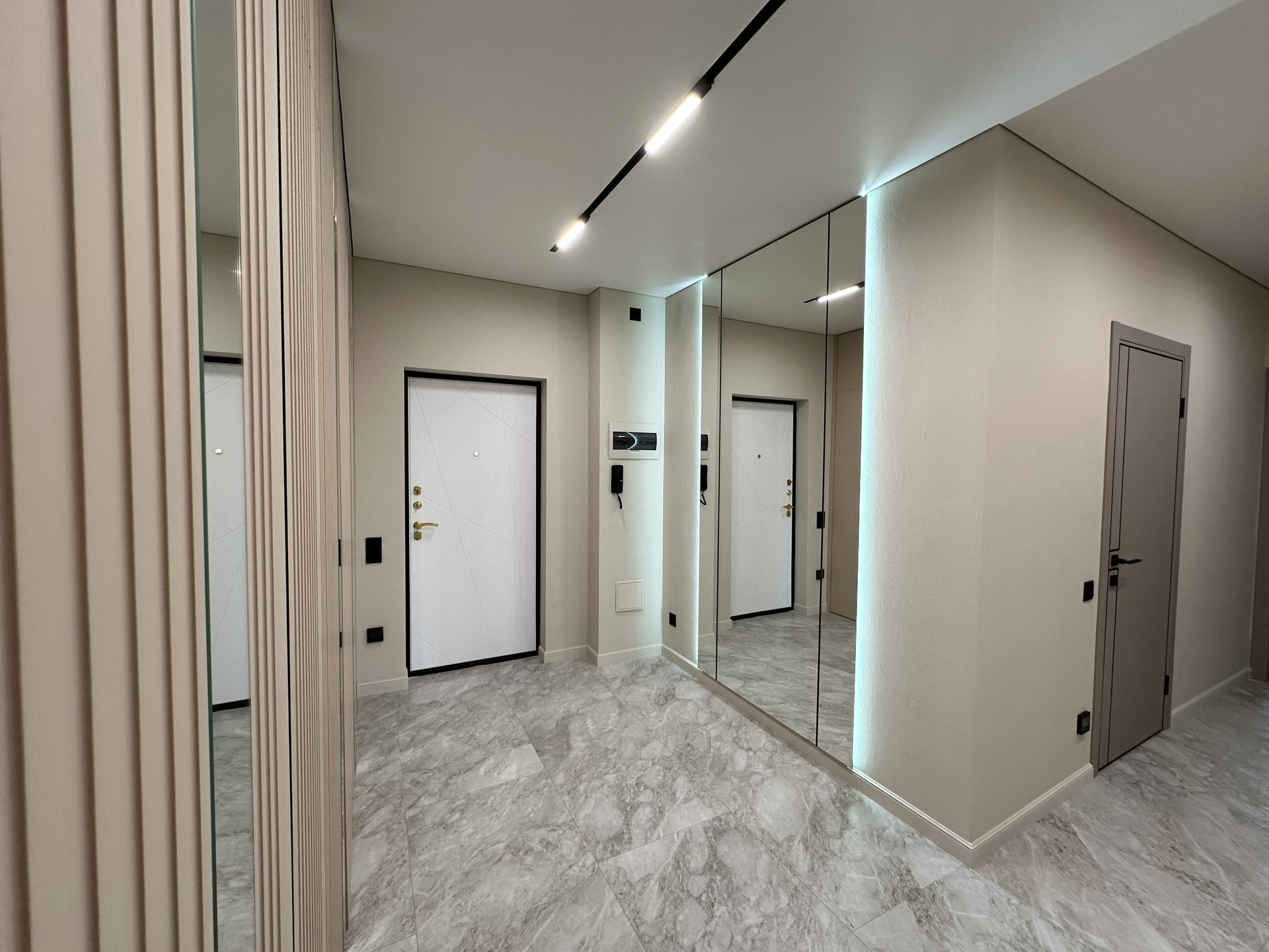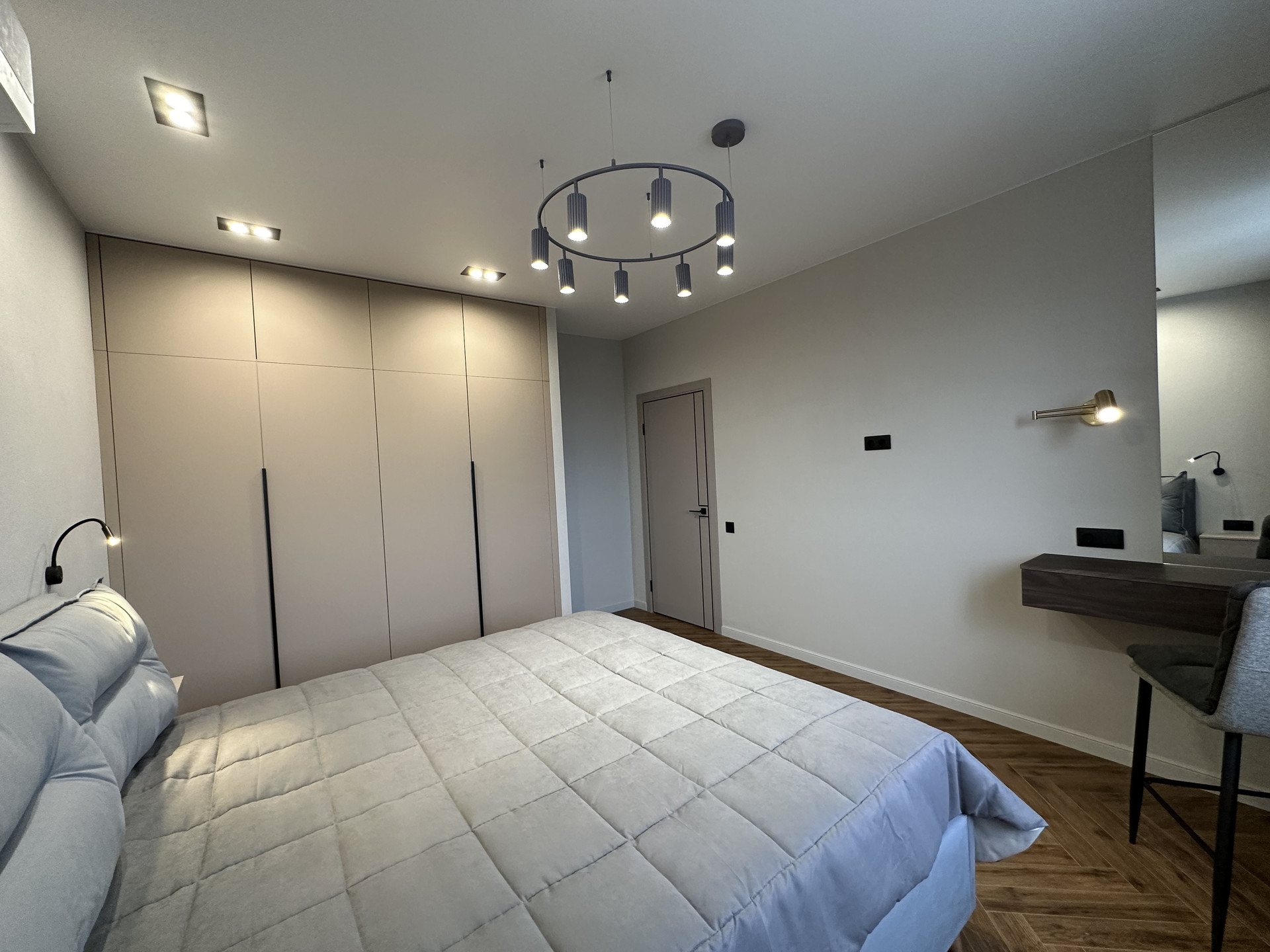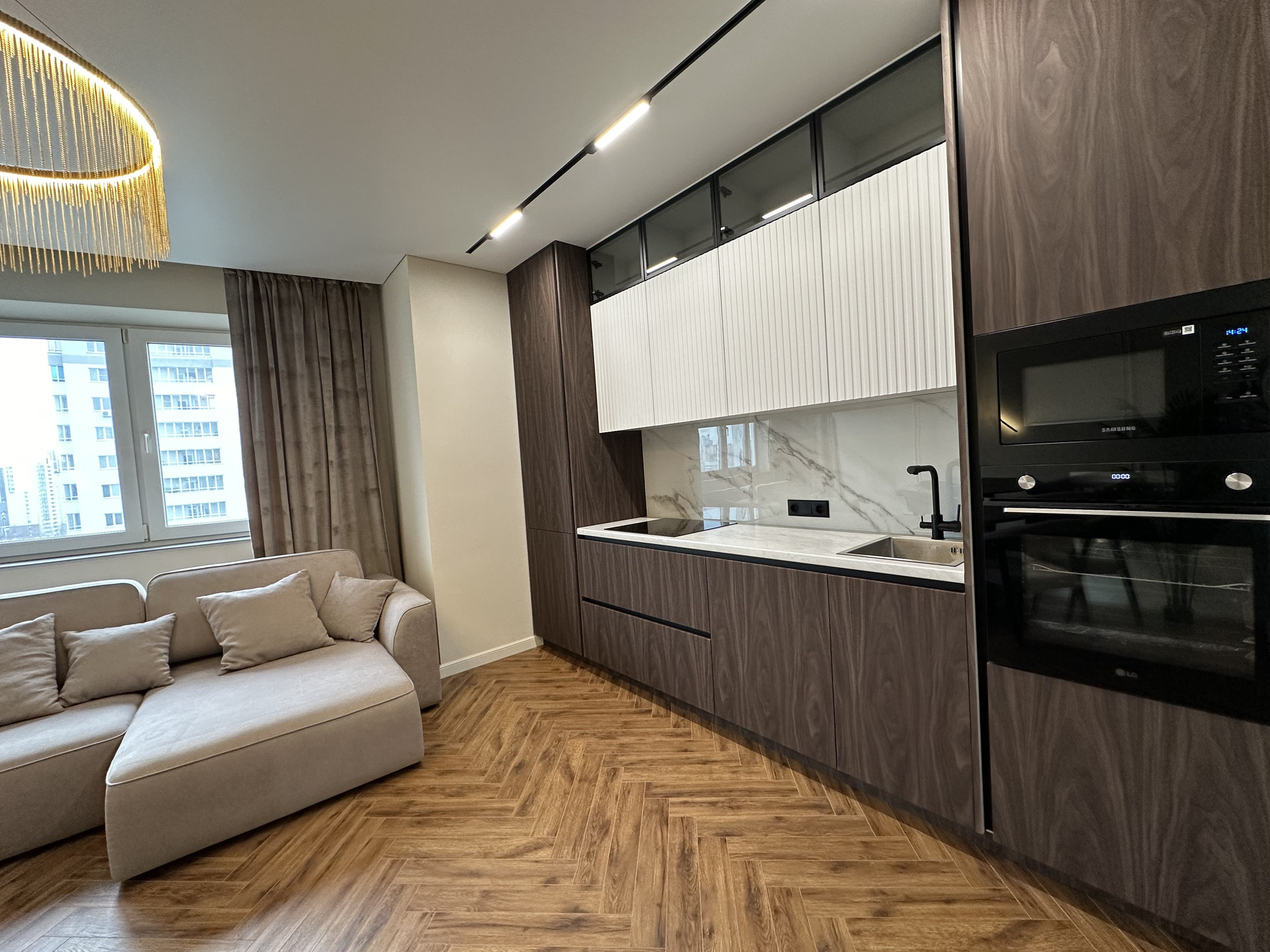 Квартира укомплектована всем необходимым для жизни: кухонный гарнитур со встроенной техникой: духовой шкаф, варочная поверхность, вытяжка, встроенный холодильник, посудомоечная машина 60см, диван, обеденная зона, телевизор, кондиционеры, шкафы в спальных и огромная система хранияния в коридоре, кровать с прикроватными тумбами. Все освещение немецкой марки Maytoni.