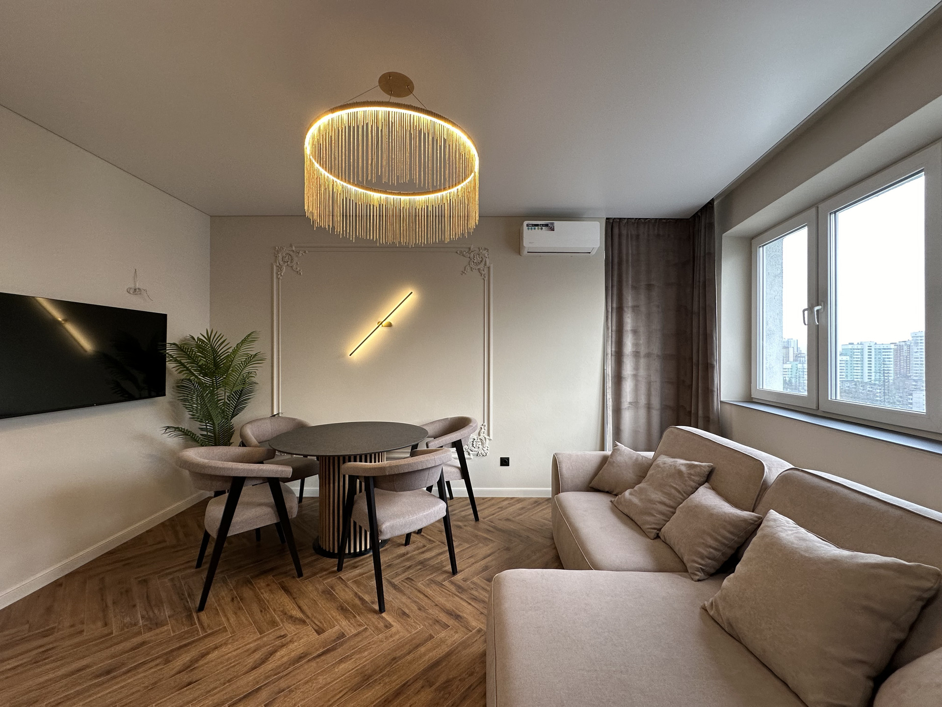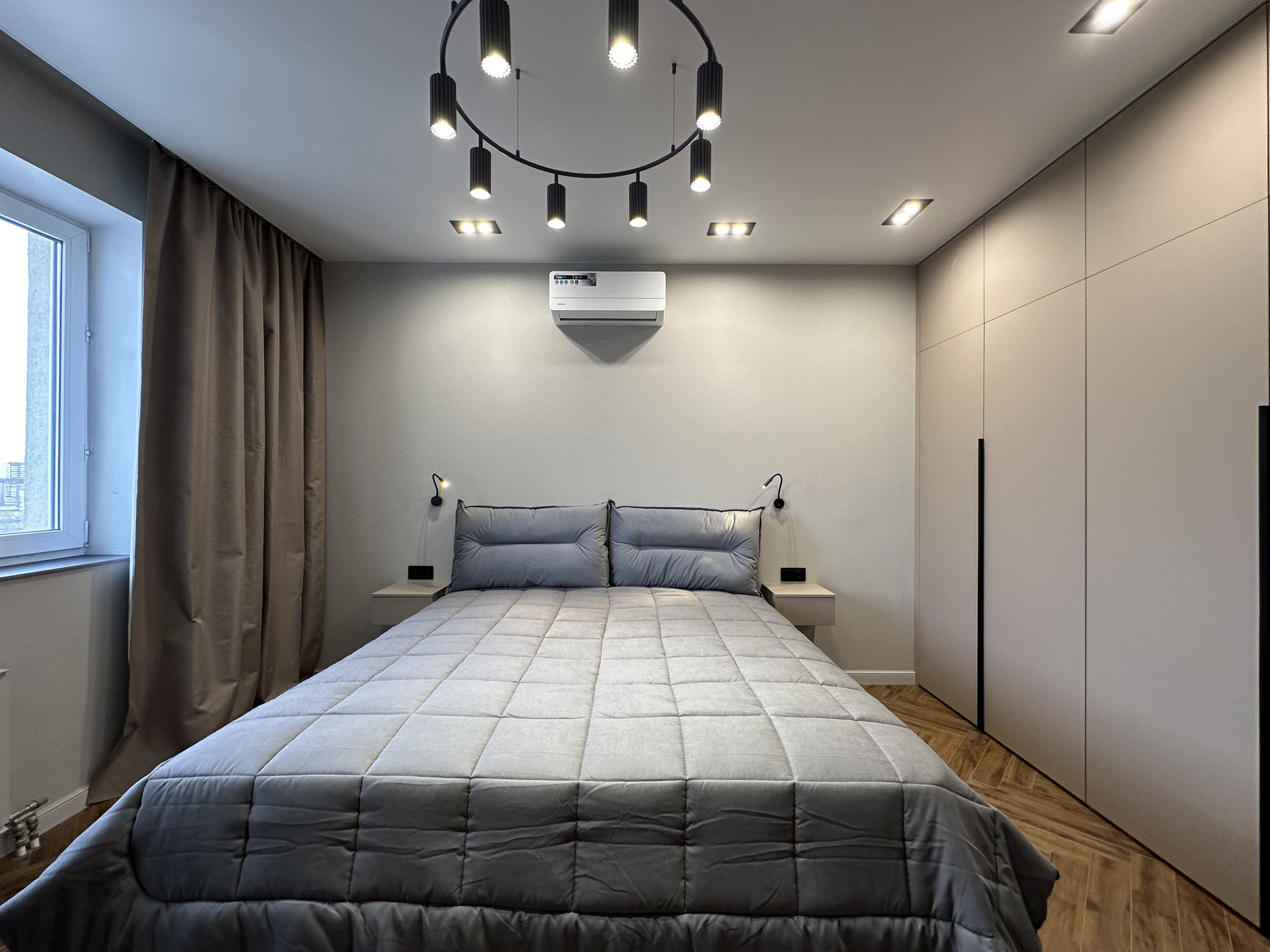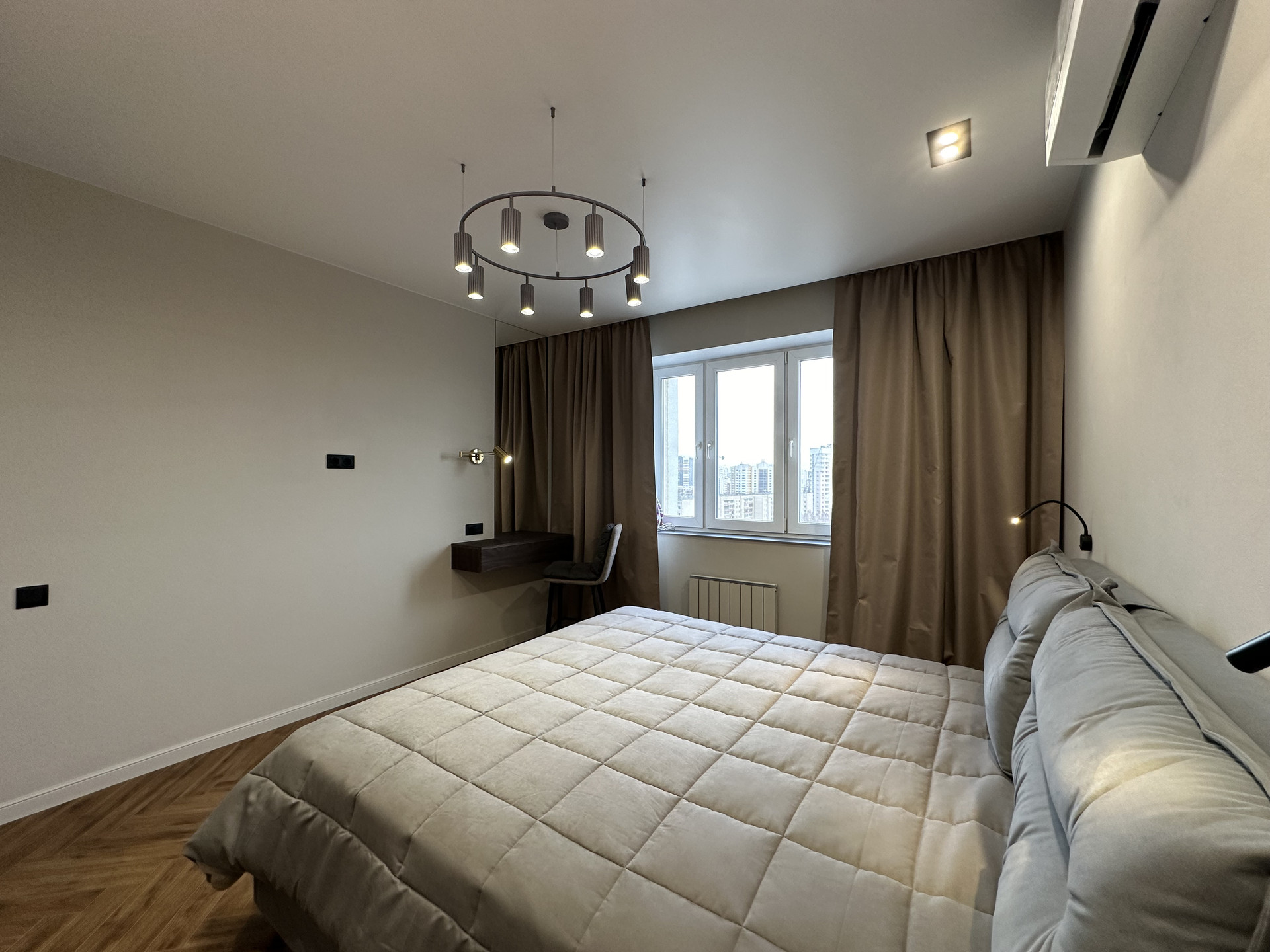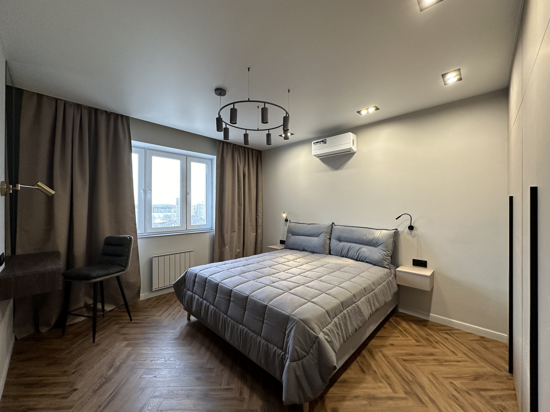Окна квартиры выходят на 2 стороны: восток и юг. В квартире всегда много солнечного света, установлены многофункциональные кондиционеры для комфортного проживания.