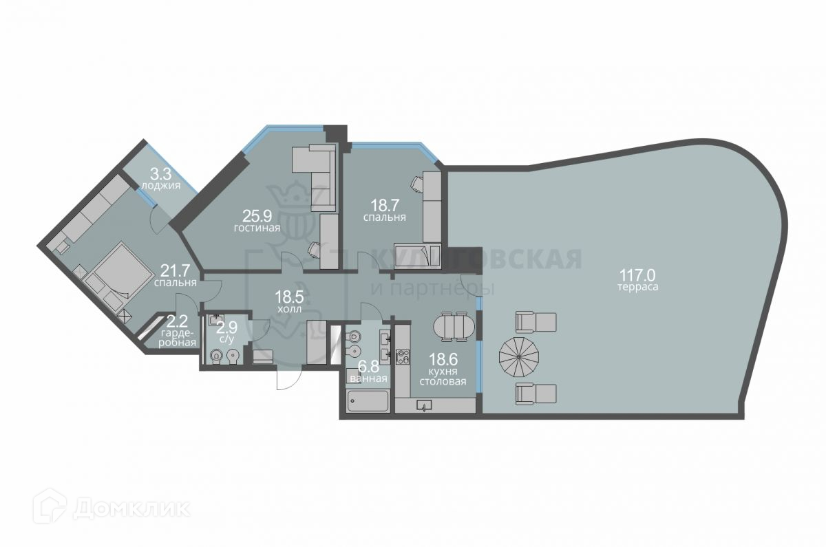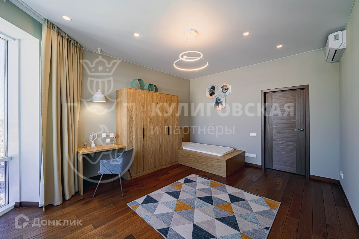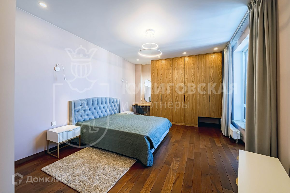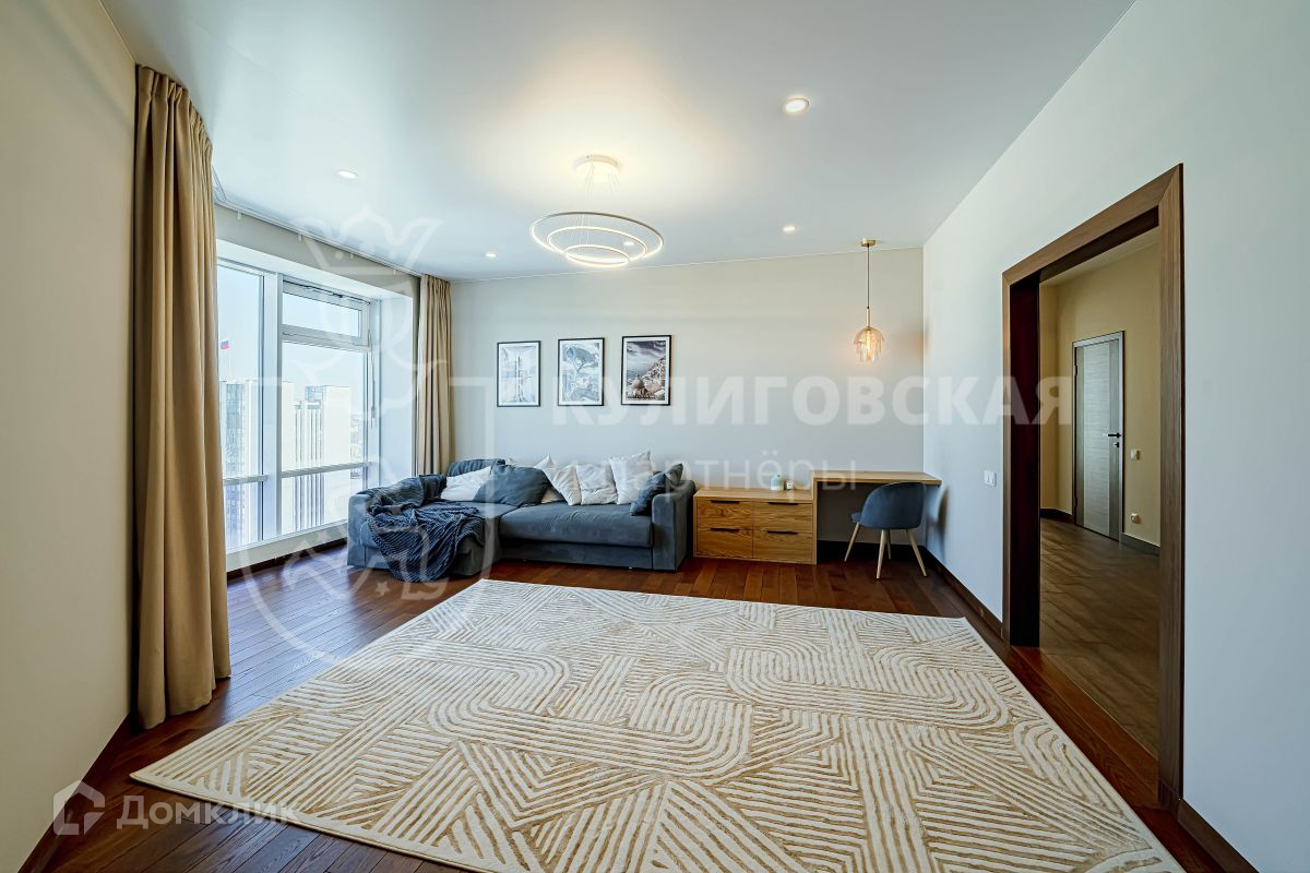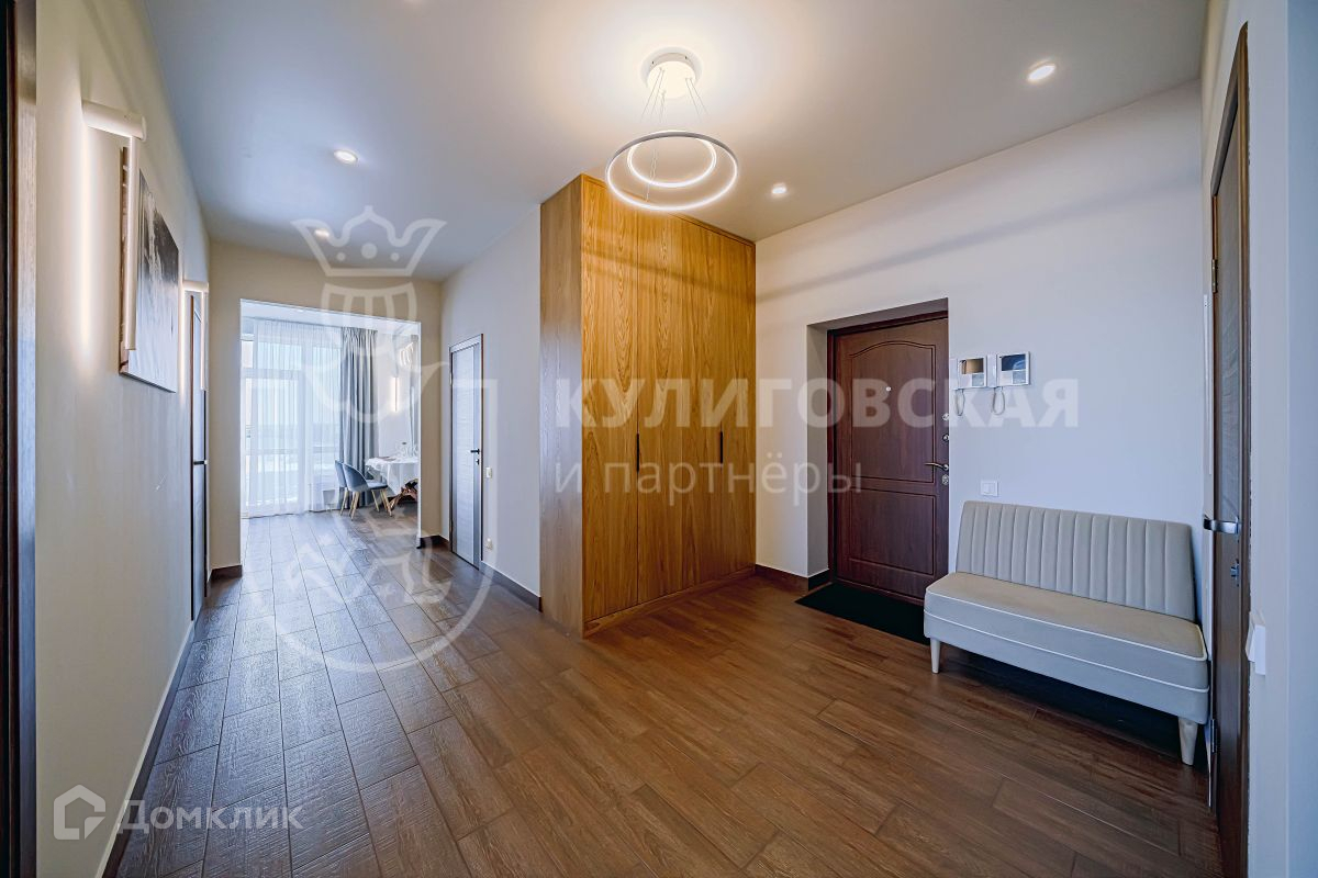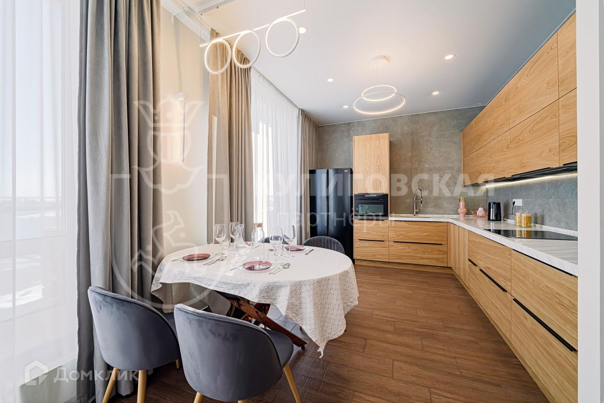 В квартире удобная планировка: просторный холл, гостиная комната, две спальни, два санузла, гардеробная, лоджия, кухня-столовая и терраса площадью 117 кв. м. Высокие потолки и огромные панорамные окна наполняют квартиру естественным светом и солнцем.