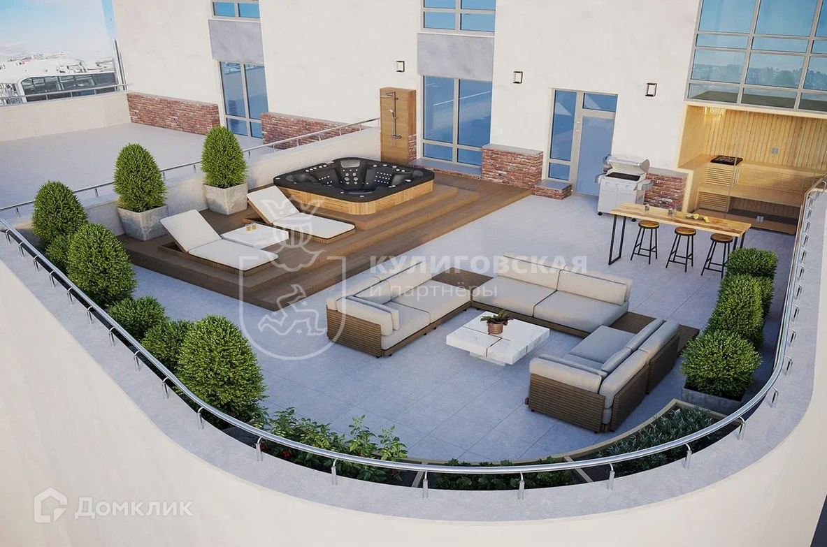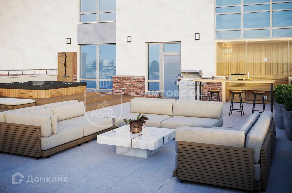 На террасу выведены вода и электрика, уложена плитка, в полу вмонтировано водоотведение для талого снега. Вы можете использовать террасу по своему усмотрению. Летом обустроить зону отдыха, поставить барбекю, лежаки и бассейн, а зимой красиво украсить и поставить большую живую ель.