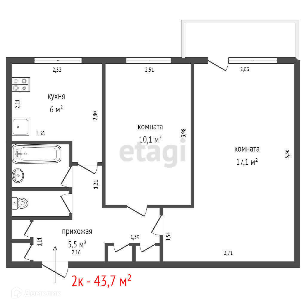 Общая площадь 43.7 м2