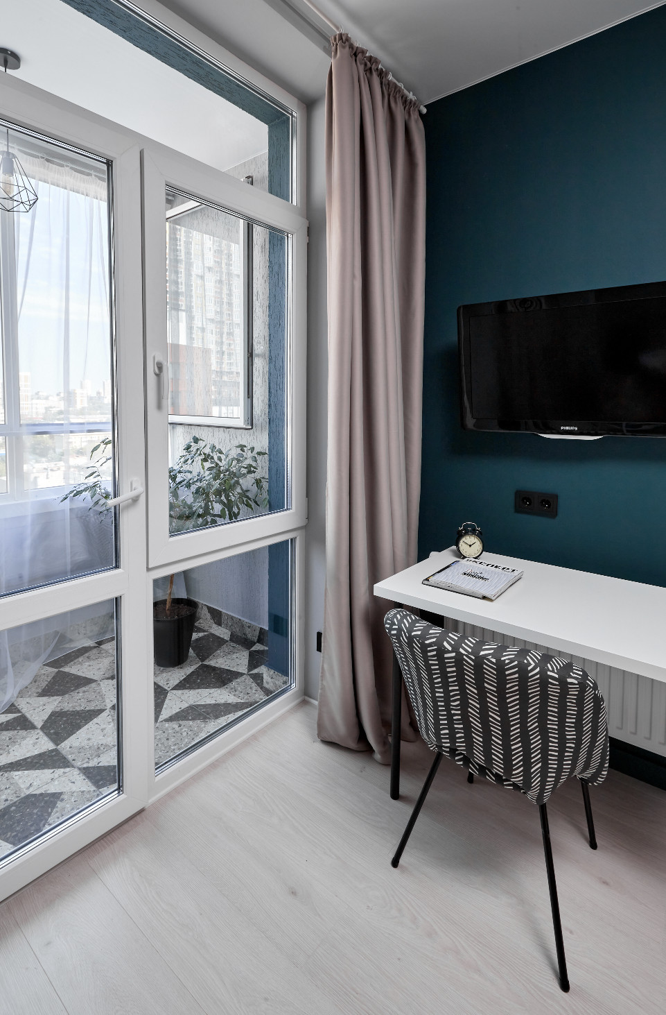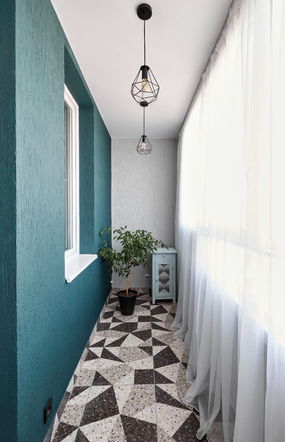 Огромный балкон, который можно обустроить в зону отдыха оснащен подвесными светильниками. Стены выкрашены фасадной краской в цвет стен в прихожей и основной комнате.