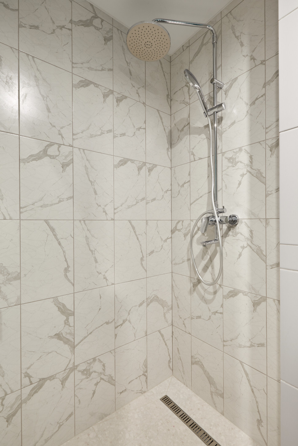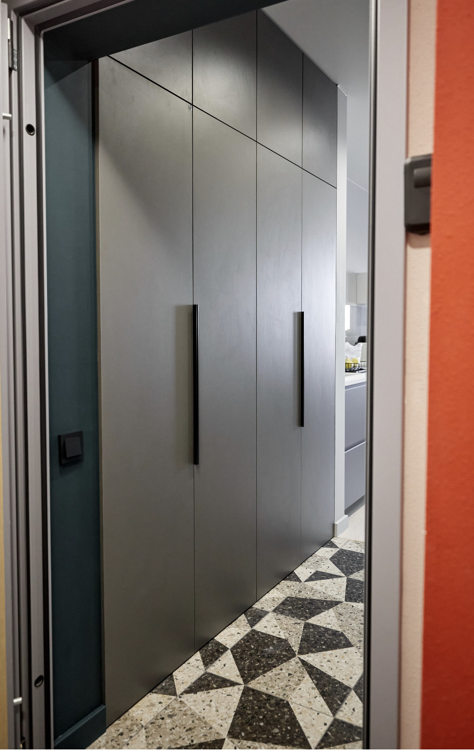 В зоне прихожей встроенный огромный, вместительный шкаф. На полу керамогранит в виде мозаики.
