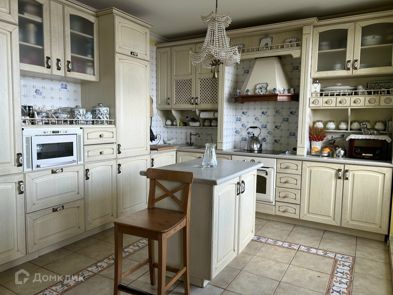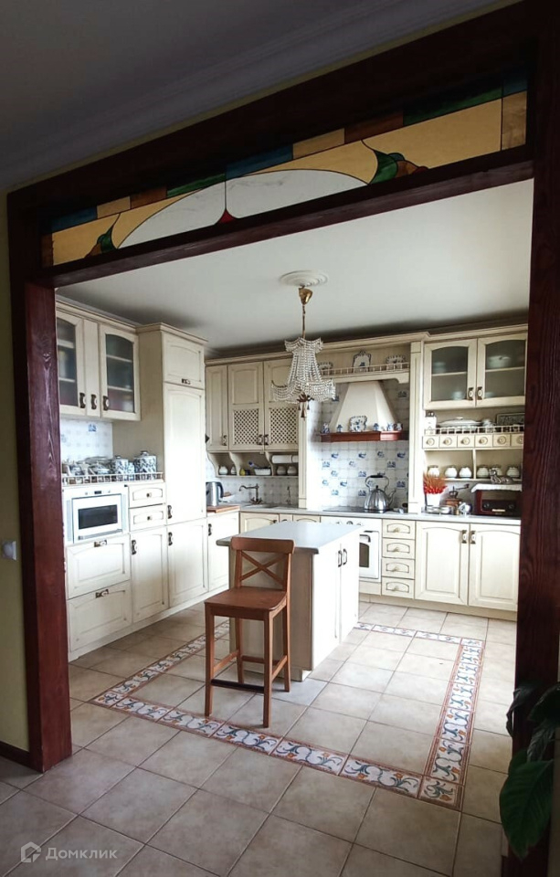 Кухня-столовая – 33,7 м2. Витраж Тиффани, в котором вечером отражаются отблески заходящего солнца, разделяет зону кухни и гостиной. Кухня светлая выполнена из натуральной березы с удобной зоной приготовления пищи. В кухне утеплены все стены. Теплый электрический пол