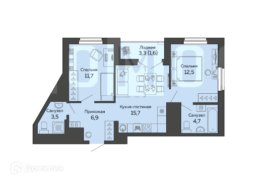 Общая площадь 56.5 м2