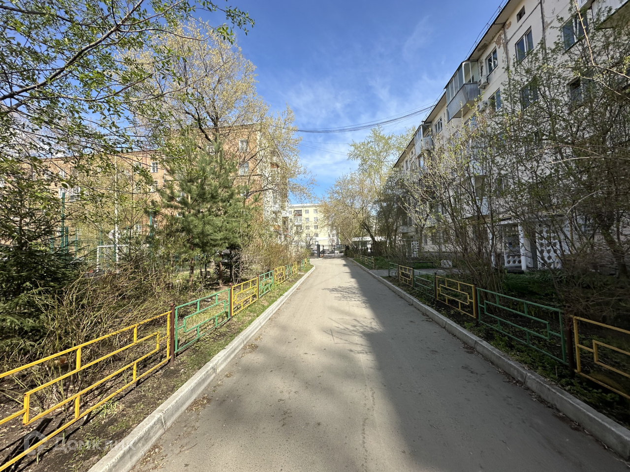 Дом находится в дали от дороги. Окна выходят во двор и сквер.